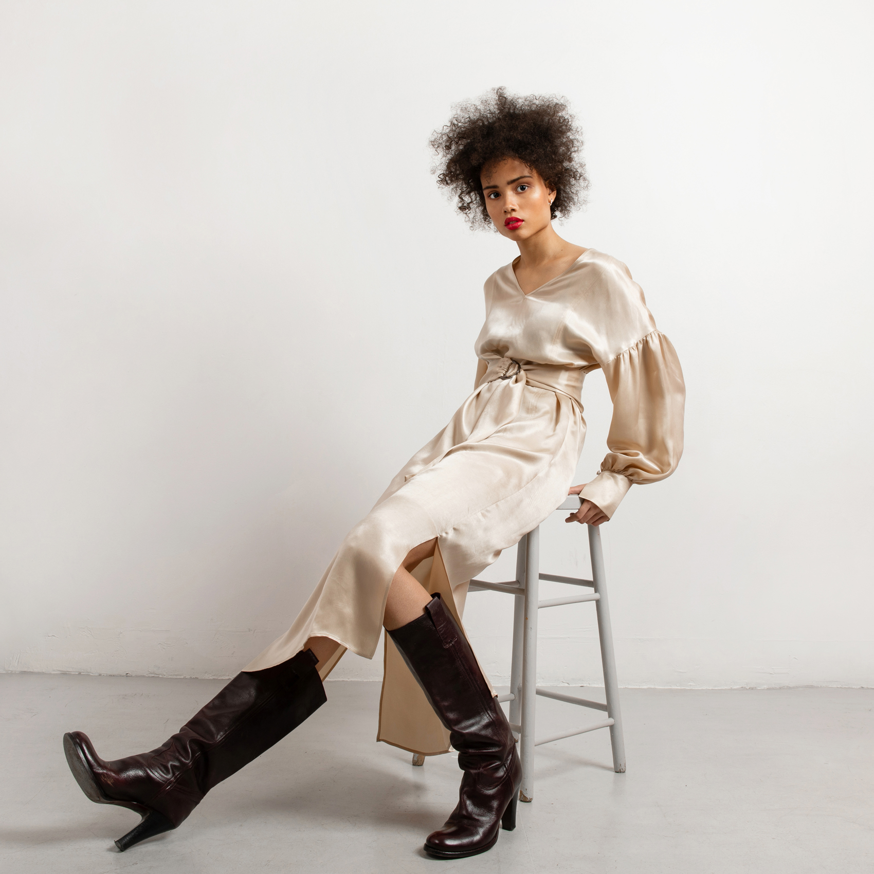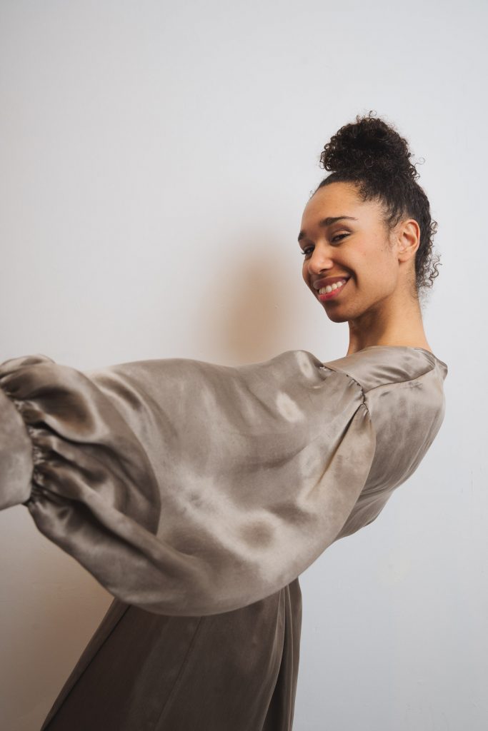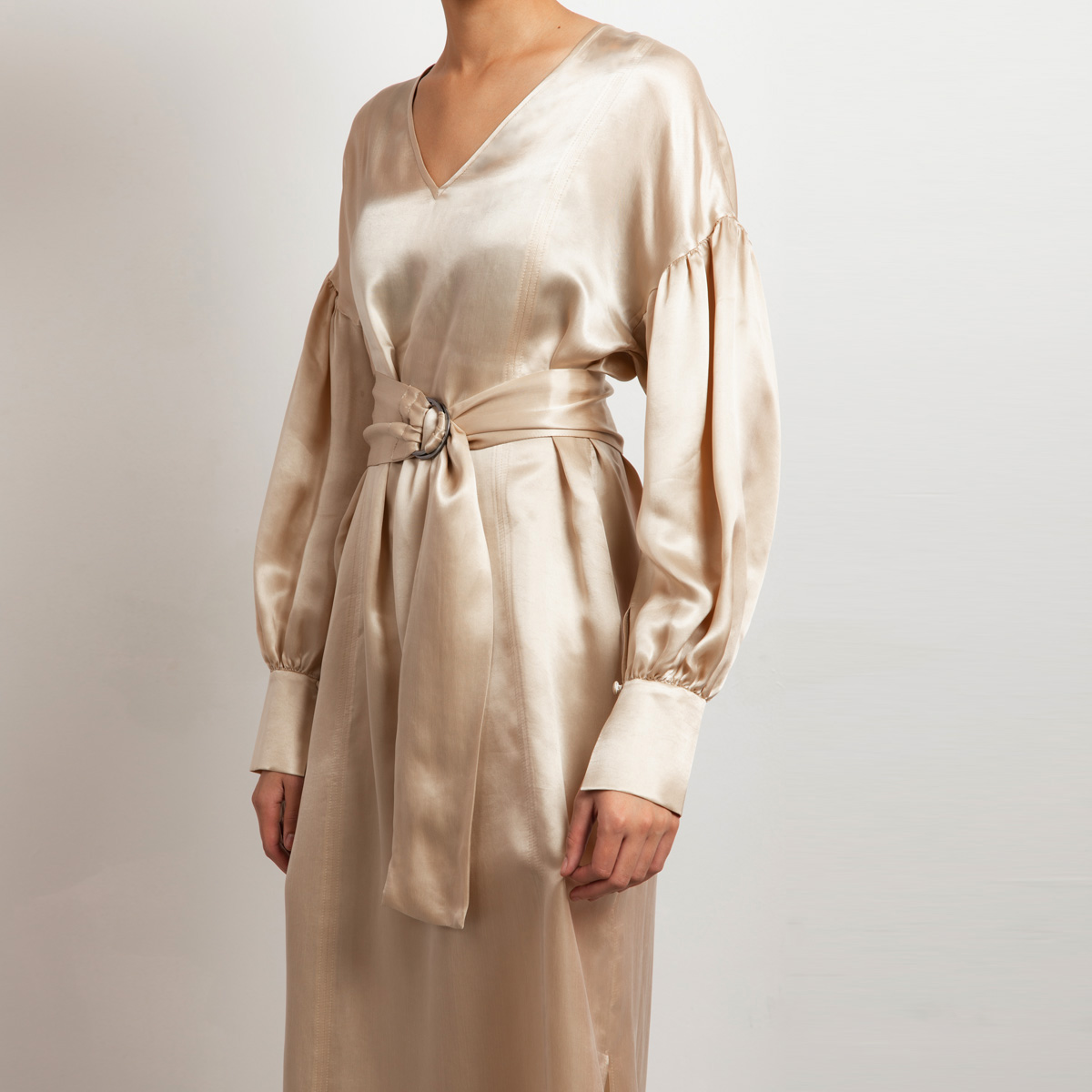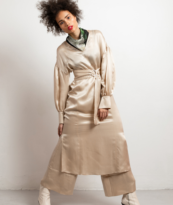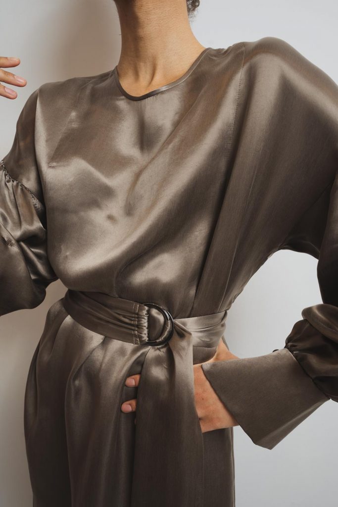 The cupro is made in Italy and the dress is crafted by our skilled seamstresses in our atelier in Lithuania.