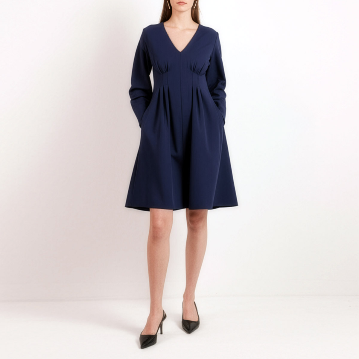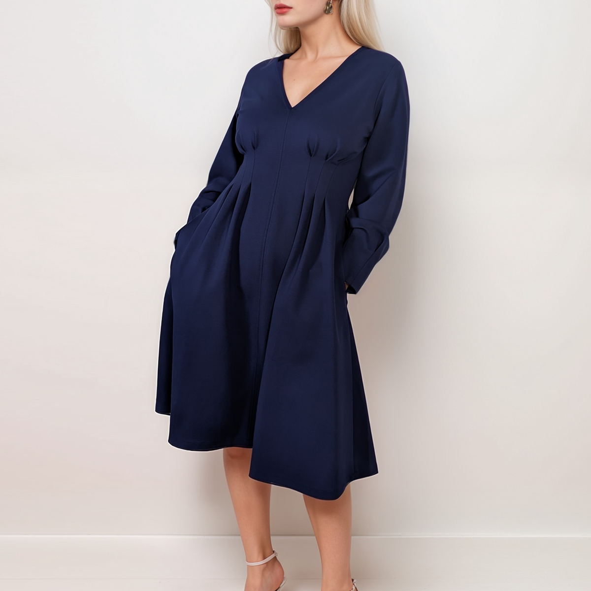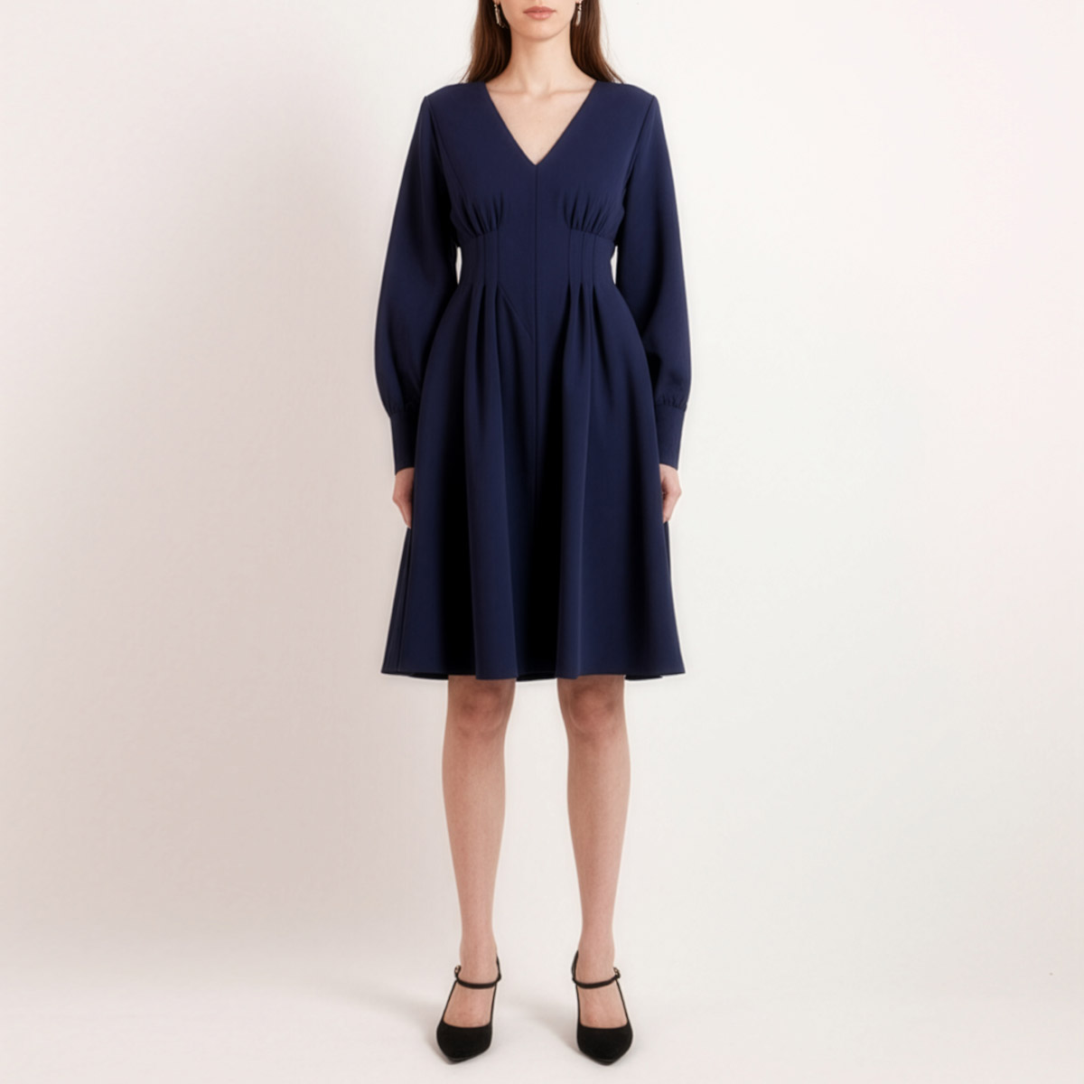 The deep V-neckline and tailored bodice create an elongating effect, while the subtle pleats beneath the bust add gentle volume and flow. Designed with long sleeves and a knee-length hem, it transitions effortlessly between seasons. Moreover, the midnight blue shade adds depth and versatility—elegant enough for evening, yet understated enough for daytime wear.