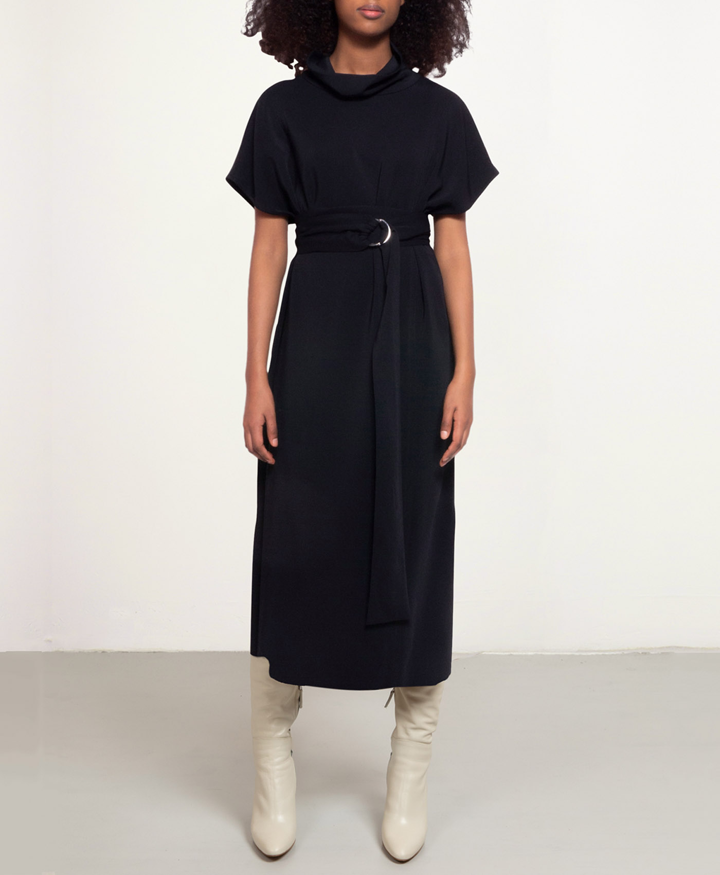 The Sunday dress is available in short, midi and long length. Choose between a short sleeve or a cascading gathered sleeve. You can choose either a round neck or a cowl neck as a neckline detail. Sunday dress is available in silk crepe, printed silk twill (limited edition) and Italian Cady stretch fabric.