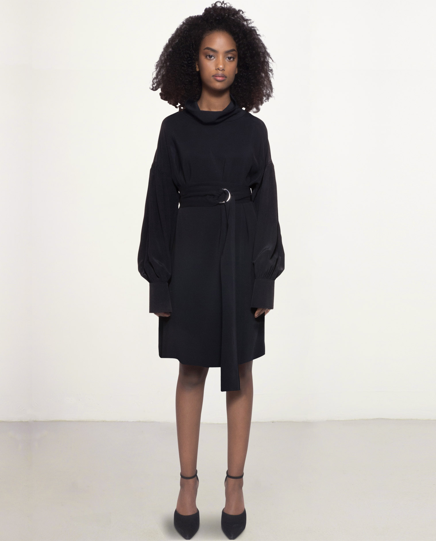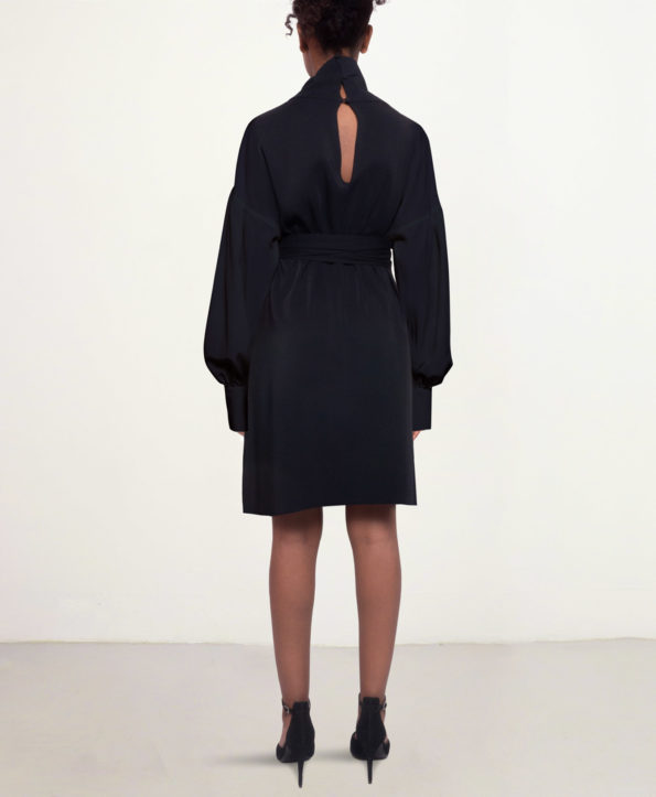 The Sunday dress is available in short, midi and long length. Choose between a short sleeve or a cascading gathered sleeve. You can choose either a round neck or a cowl neck as a neckline detail. Sunday dress is available in silk crepe, printed silk twill (limited edition) and Italian Cady stretch fabric.