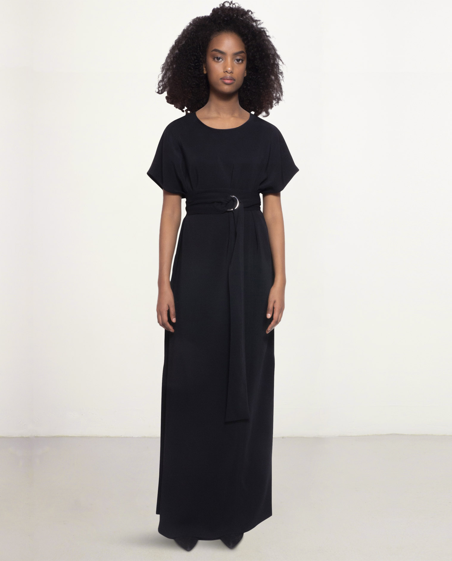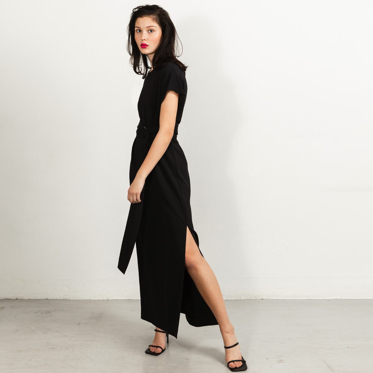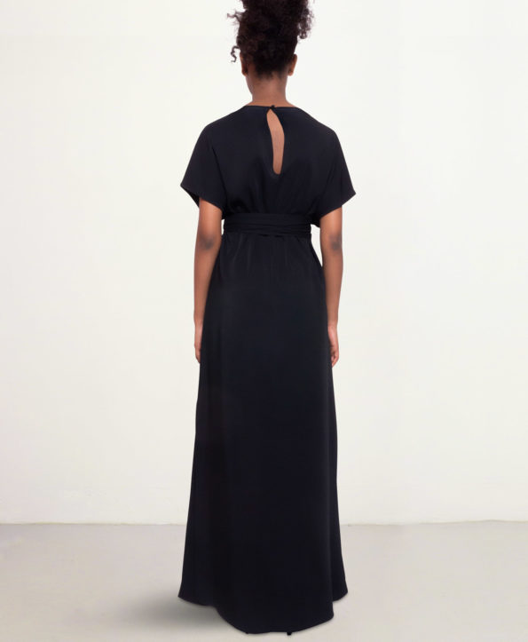 We love the versatility of this custom-fit black dress. Depending on how you customize it, it can either become your best basic or your outstanding evening gown. Choose the cascading gathered sleeves and wear with the belt to accentuate your waist and temper the flowing fit. The short black version with short sleeves is bound to become your wardrobe favorite and everyday dress. The long versions have a high slit in the side reveals just enough leg. Wear yours to parties with sandals and velvet clutch.