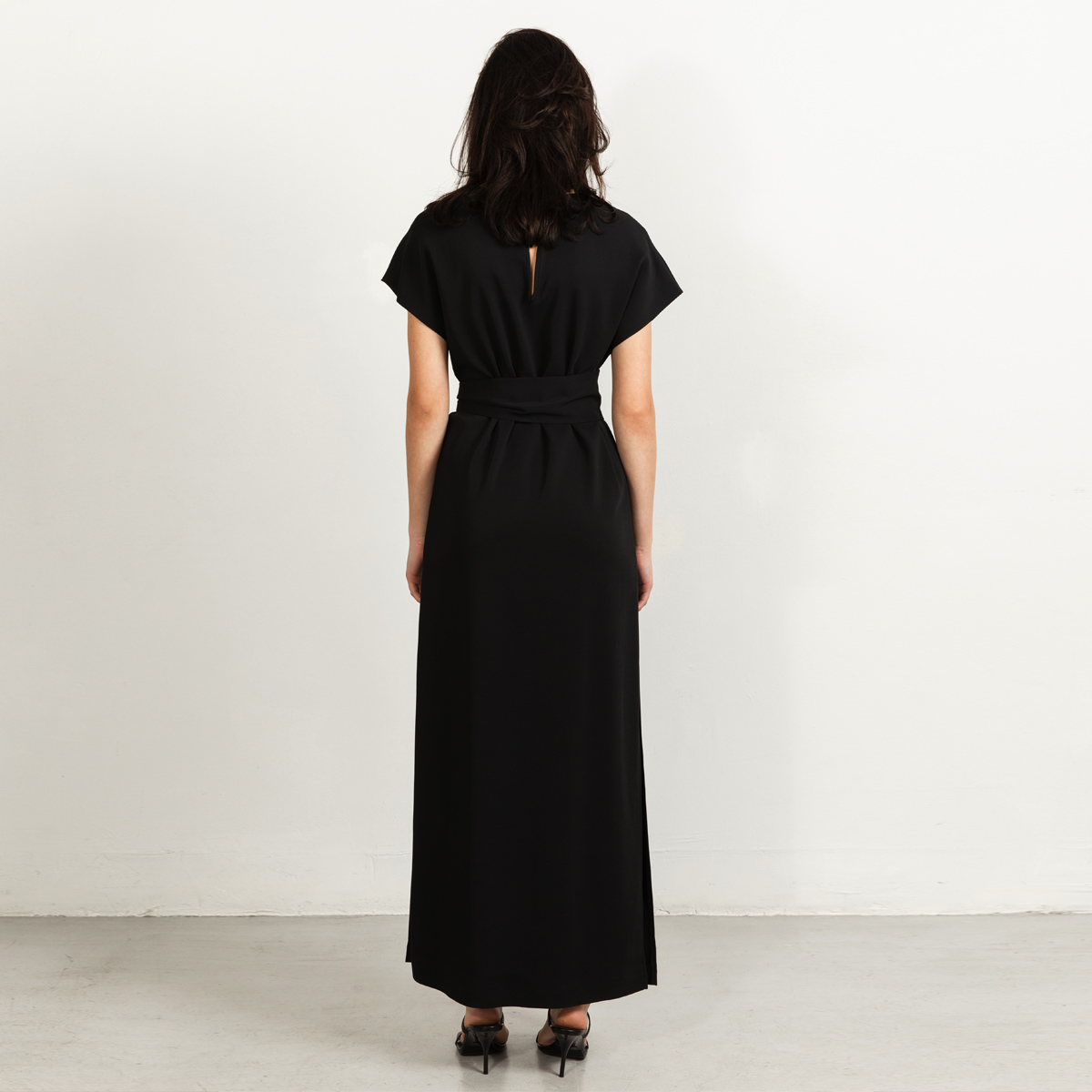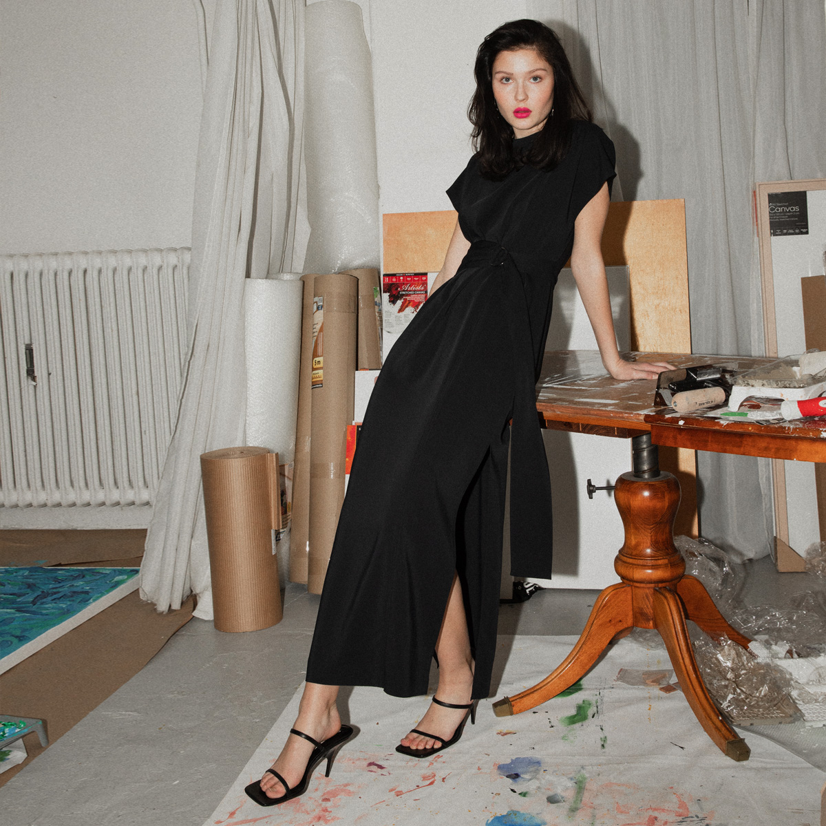 The Sunday dress is available in short, midi and long length. Choose between a short sleeve or a cascading gathered sleeve. You can choose either a round neck or a cowl neck  as a neckline detail. Sunday dress is available in silk crepe, printed silk twill (limited edition) and Italian Cady stretch fabric.