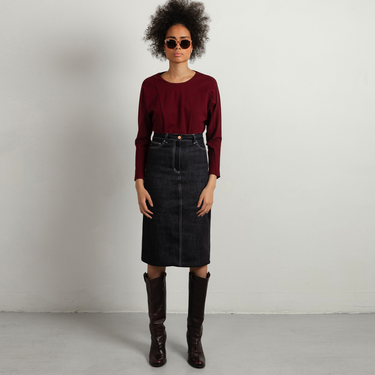 Our newest addition to the “Custom-fit wardrobe Essentials”: The denim skirt. This version comes in a flattering length, just under the knee, and has a straight silhouette. The stitchings are in fresh off-white colour. The elegant cut combines with the unwashed denim makes this denim skirt an updated version of a classic denim skirt. Additionally, the denim fabric has a light stretch for your comfort.