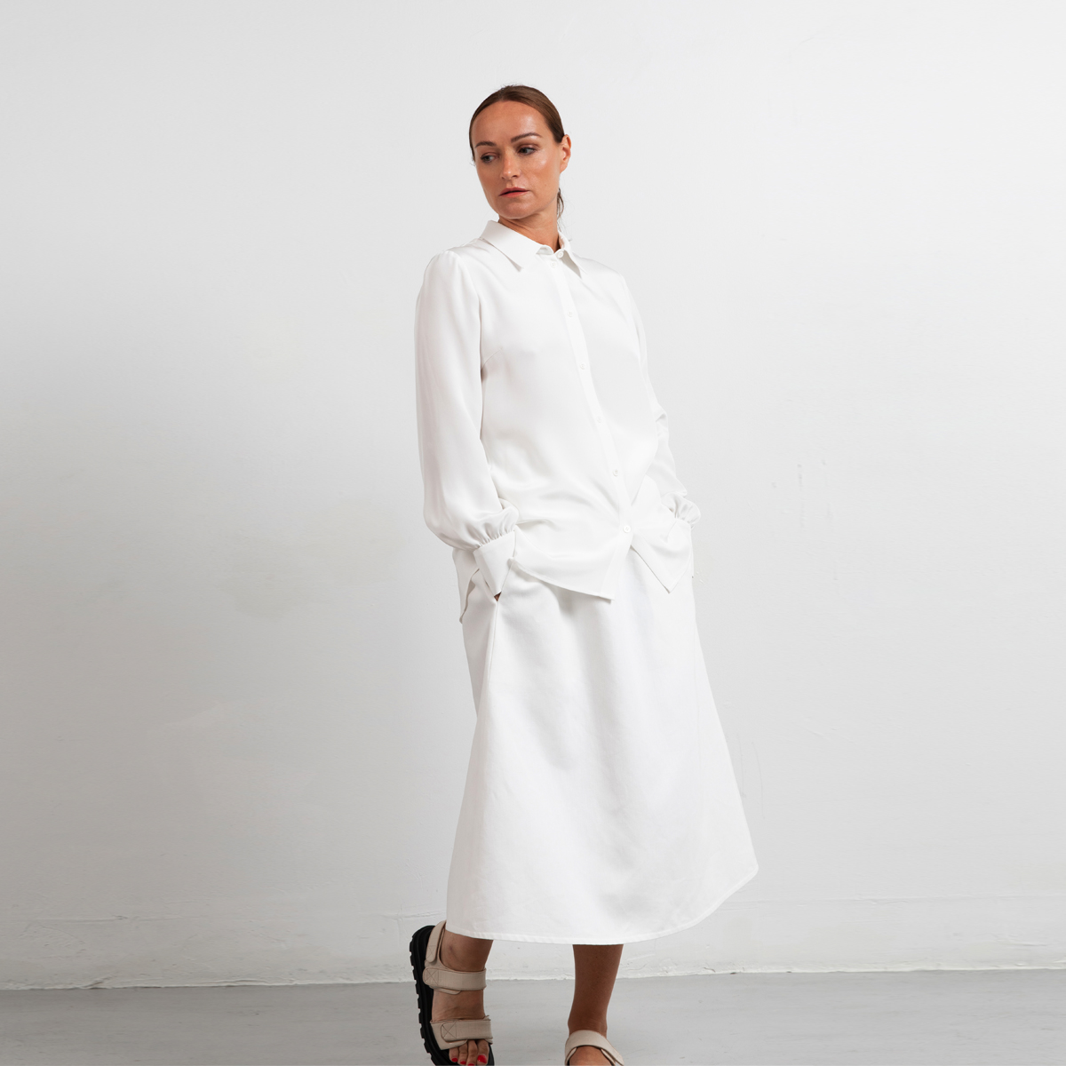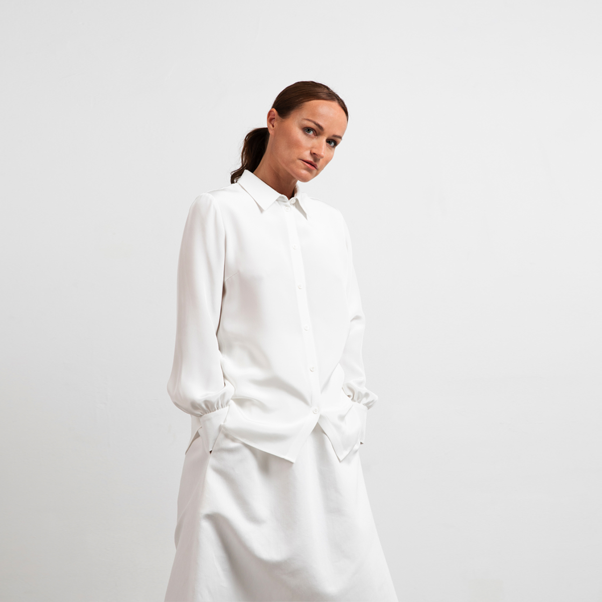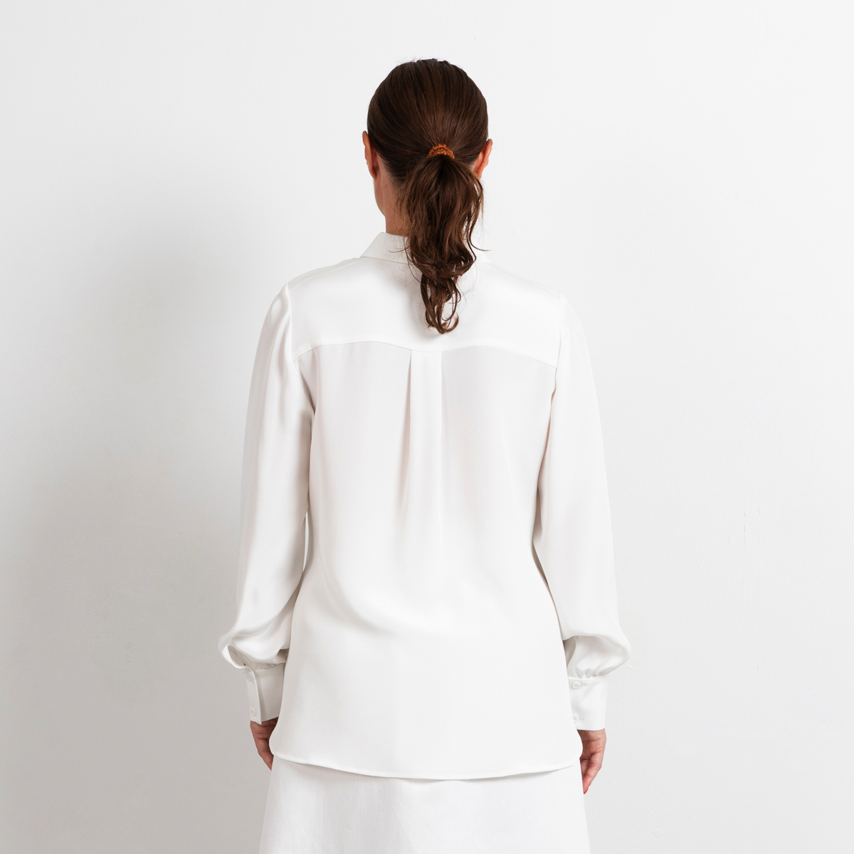 We proudly present the another new variation of custom-fit feminine shirt. The white shirt is crafted from soft silk crepe, and has feminine puff-sleeves and beautiful pearl buttons. The loose fit will ensure the hem hangs neatly over the waistband of your jeans or pants, but it’ll also look great tucked-in.