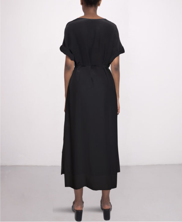 This best seller silk dress in black has a relaxed fit. With it’s simple but modern shape it’s a must-have in everyones wardrobe. Wear as tunica without belt and with mules or sneakers for a casual day look. For nights and parties tie the belt, put on on heels and you are good to go.