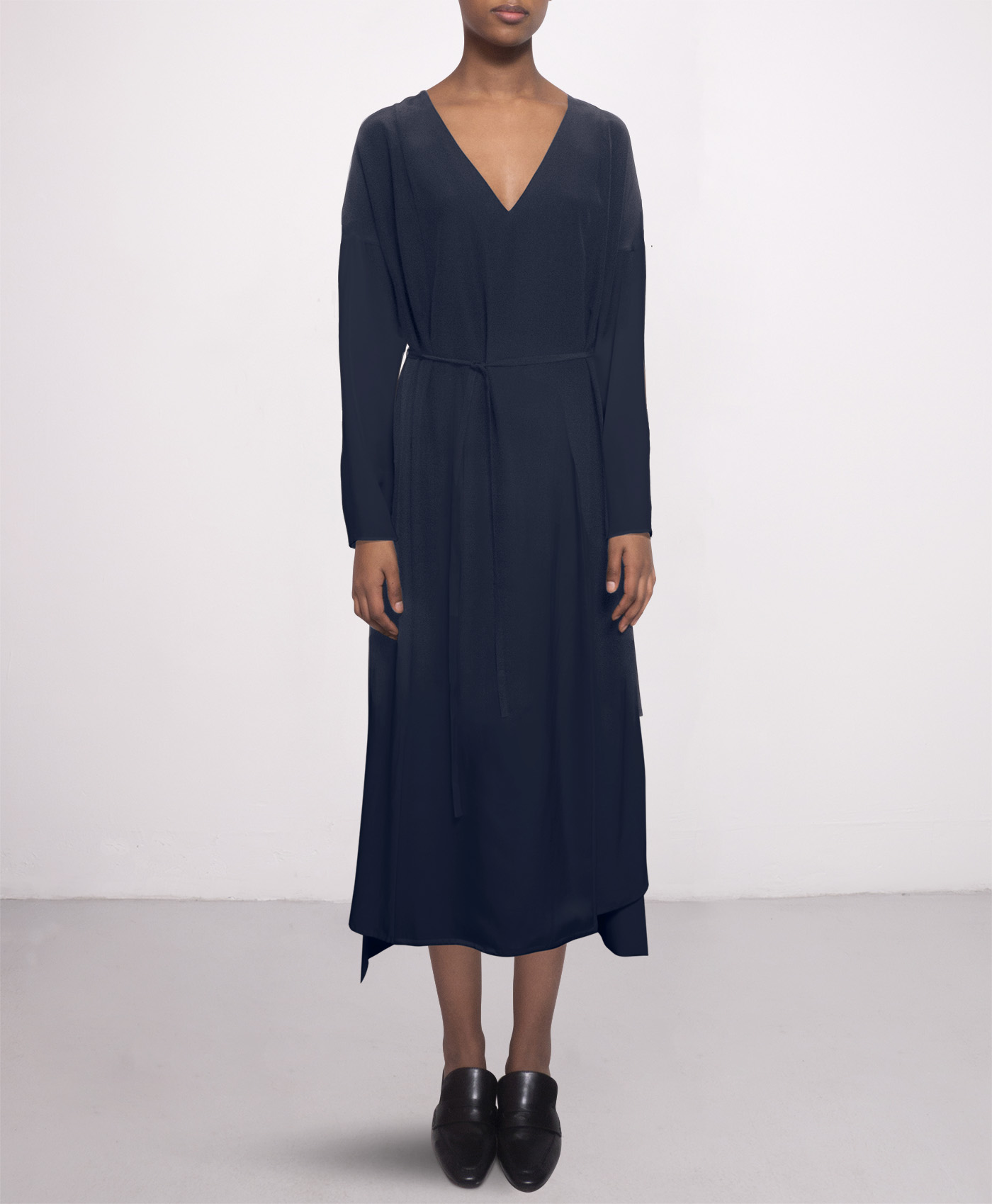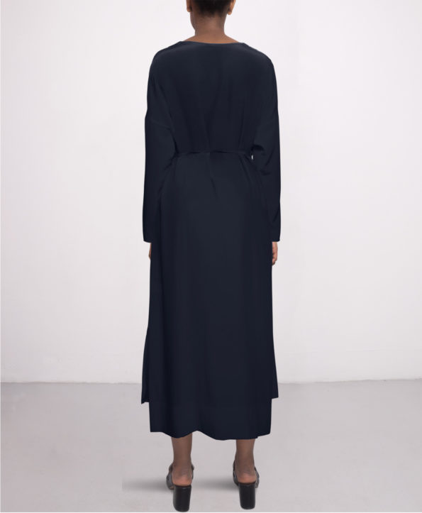 This best seller silk dress in navy blue has a relaxed fit. With it’s simple but modern shape it’s a must-have in everyones wardrobe. Wear as tunica without belt and with mules or sneakers for a casual day look. For nights and parties tie the belt, put on on heels and you are good to go.