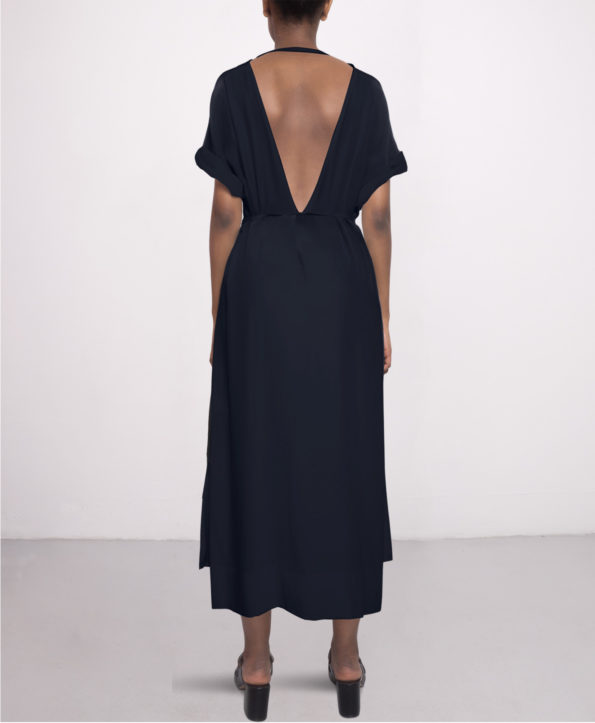 This best seller silk dress in navy blue has a relaxed fit. With it’s simple but modern shape it’s a must-have in everyones wardrobe. Wear as tunica without belt and with mules or sneakers for a casual day look. For nights and parties tie the belt, put on on heels and you are good to go.