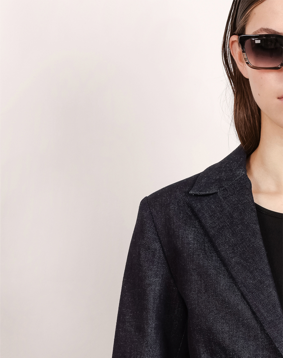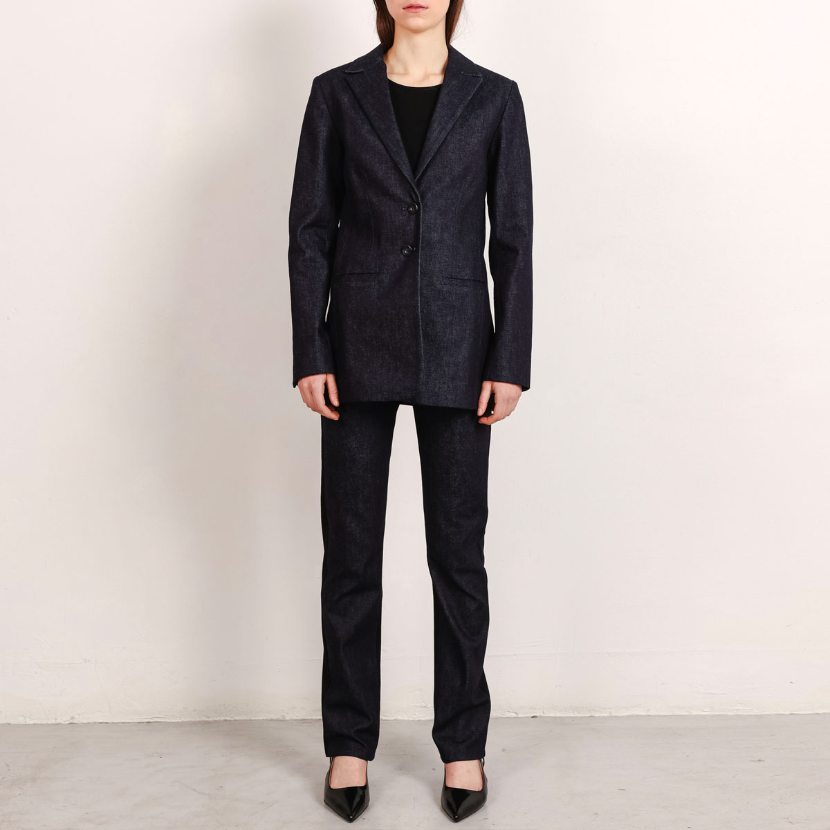Inspired by menswear, the denim blazer features details like kissing buttons, a longer silhouette and a modest lapel. However its feminine cut includes a shaped waist for a flattering embrace of your curves.