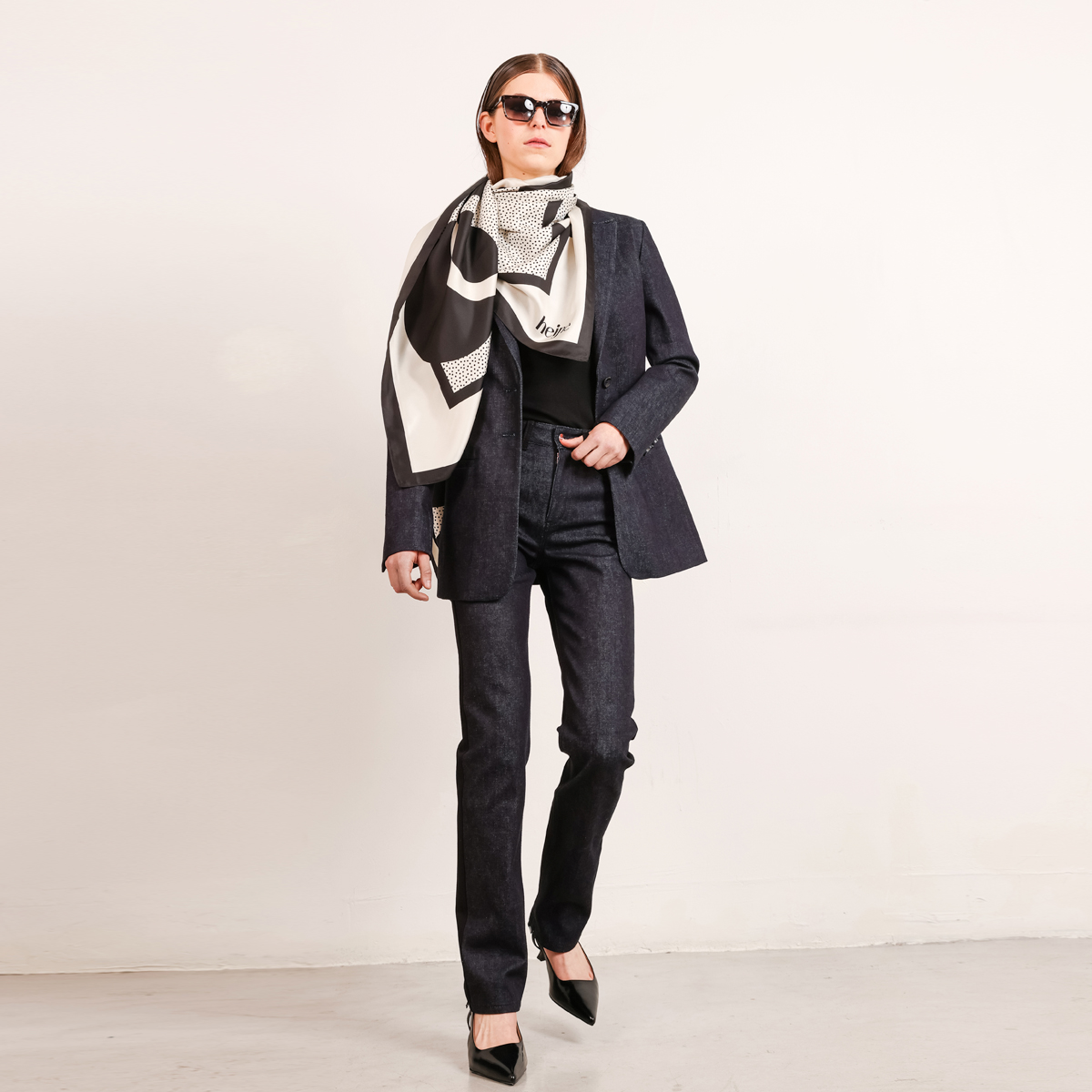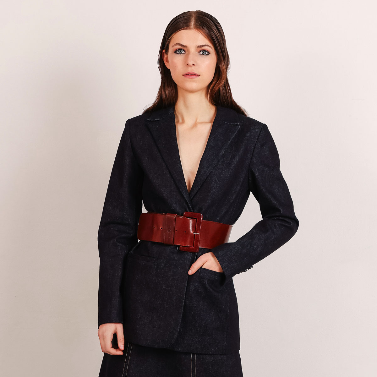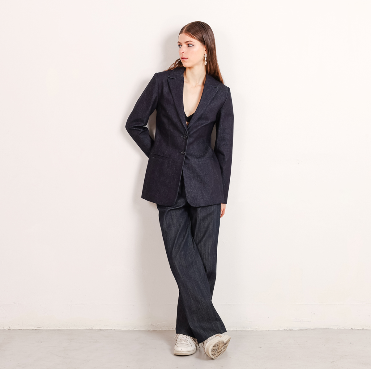 Presenting our beloved Grace Blazer in a stunning denim edition. This custom-fit selvedge denim blazer effortlessly complements matching leg jeans, as the Colour block jeans on the photo. Or go for a outstanding double denim look, combining the selvedge denim blazer with belt and the A-line denim skirt Flow