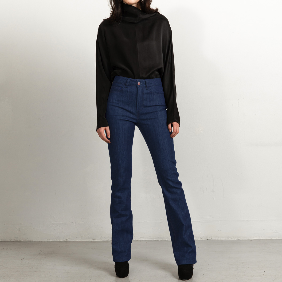 Our flared leg jeans is carefully developed to become your perfect everyday jeans. This jeans has a tight fit over the hips and seat and higher waist than regular jeans. The shape of the leg is flared. Additionally, the denim fabric has stretch that makes them ultra comfortable. The mid-blue jeans are the most stretchy and slightly thinner compared to the black and dark blue versions.  To summarize the mid blue jeans are a fresh new blue hue to our collection, a real classic for both summer and winter.