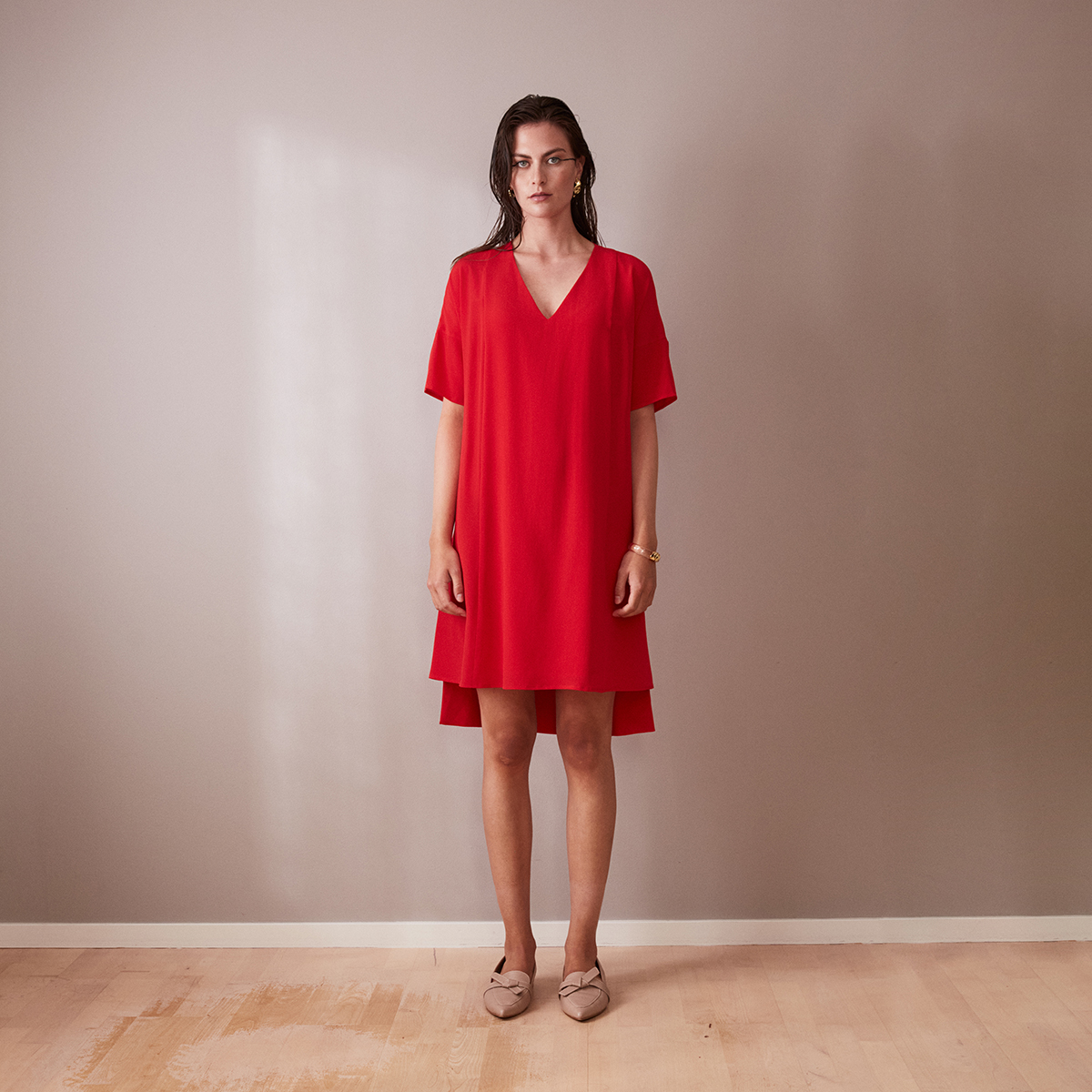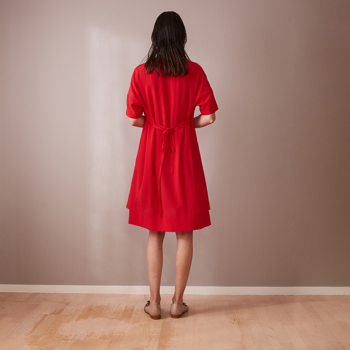 Step into effortless style with our short red silk crepe day dress, designed for the modern woman who values comfort and elegance. This knee-length dress features a relaxed fit and loose silhouette, allowing you to move freely while looking effortlessly chic.