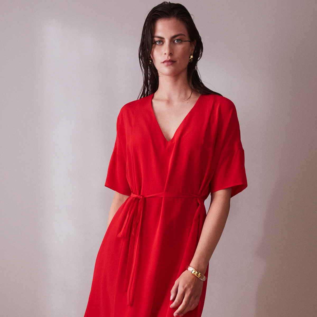 The red silk crepe fabric is a limited edition in our ready-to-wear collection. That means that there are only a few items available. Be quick if you like this beautiful dress!