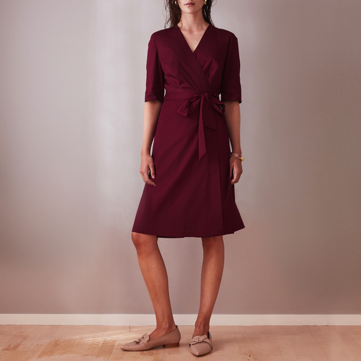 Whether worn alone or styled with accessories, the wine-red wrap dress in knee length is a wardrobe essential that offers endless possibilities for a variety of occasions.