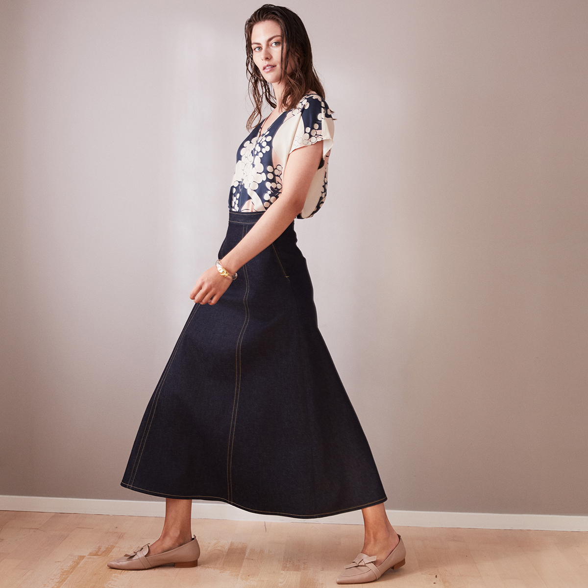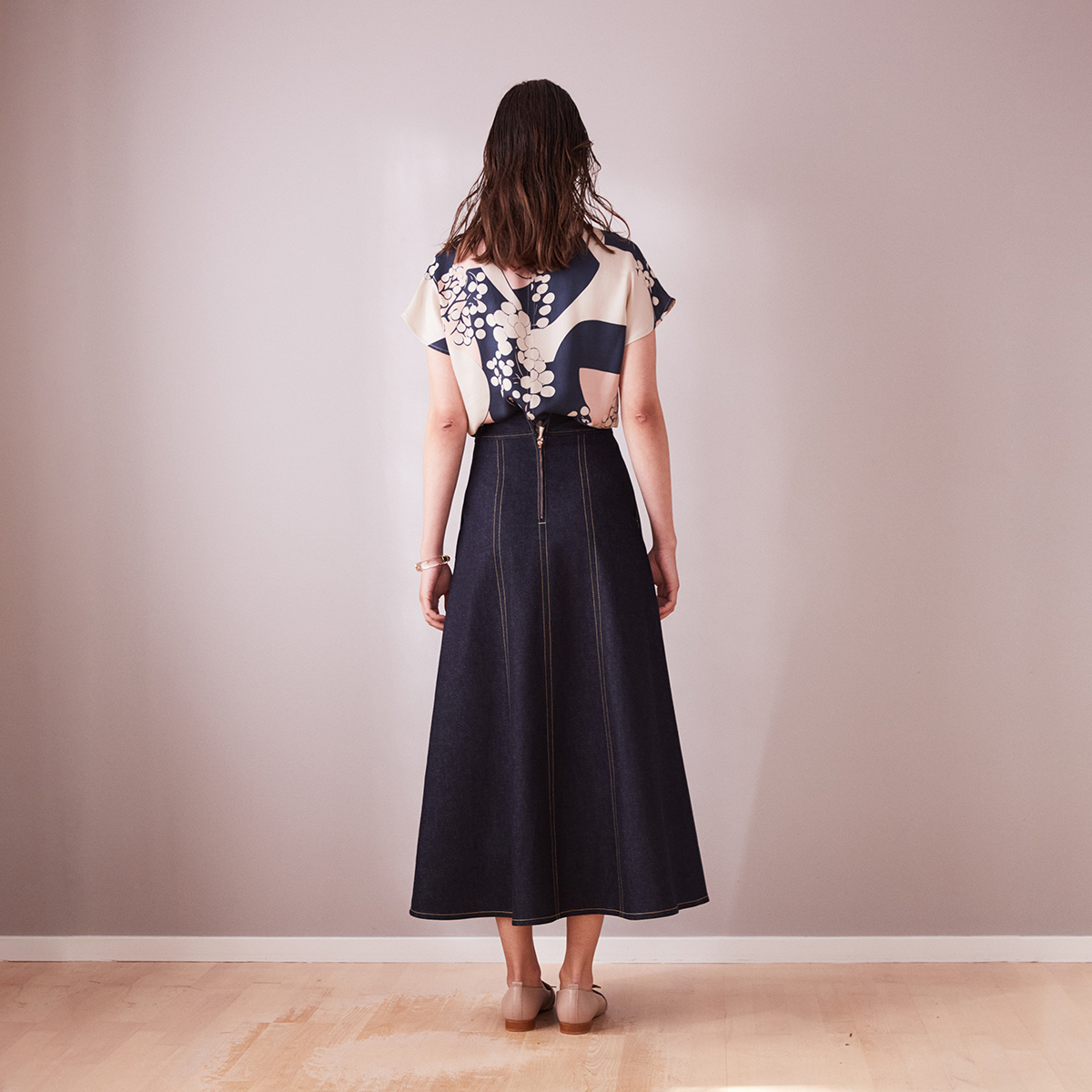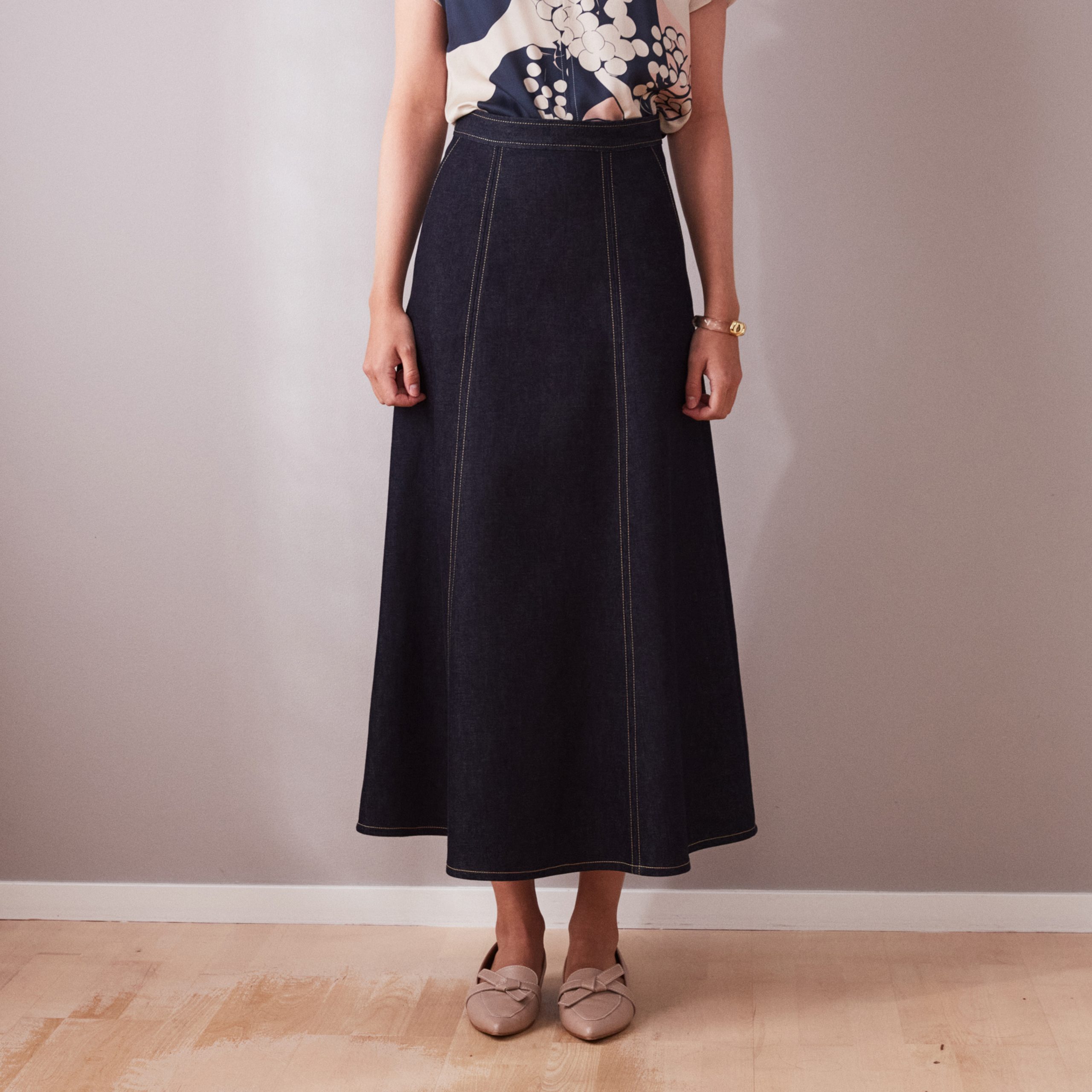 Go for the urban top-to-toe denim look and combine the wide jeans skirt with denim blazer Grace. Or dress-up with our pink silk Revolution top och dress down with a simple knitted top or sweater.