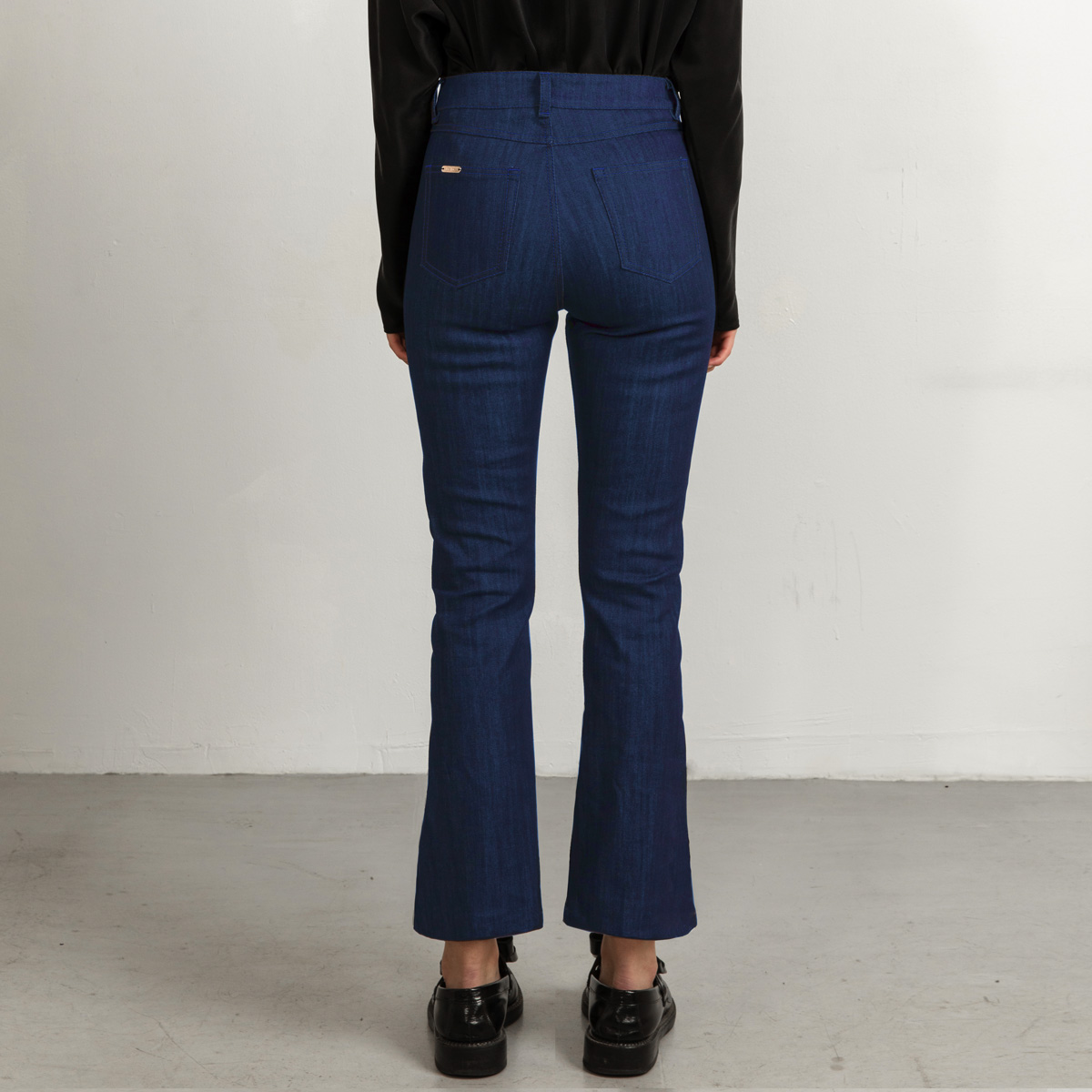 Our flared leg jeans is carefully developed to become your perfect everyday jeans. This jeans has a tight fit over the hips and seat and higher waist than regular jeans. The shape of the leg is flared. Additionally, the denim fabric has stretch that makes them ultra comfortable. The mid-blue jeans are the most stretchy and slightly thinner compared to the black and dark blue versions. To summarize the mid blue jeans are a fresh new blue hue to our collection, a real classic for both summer and winter.