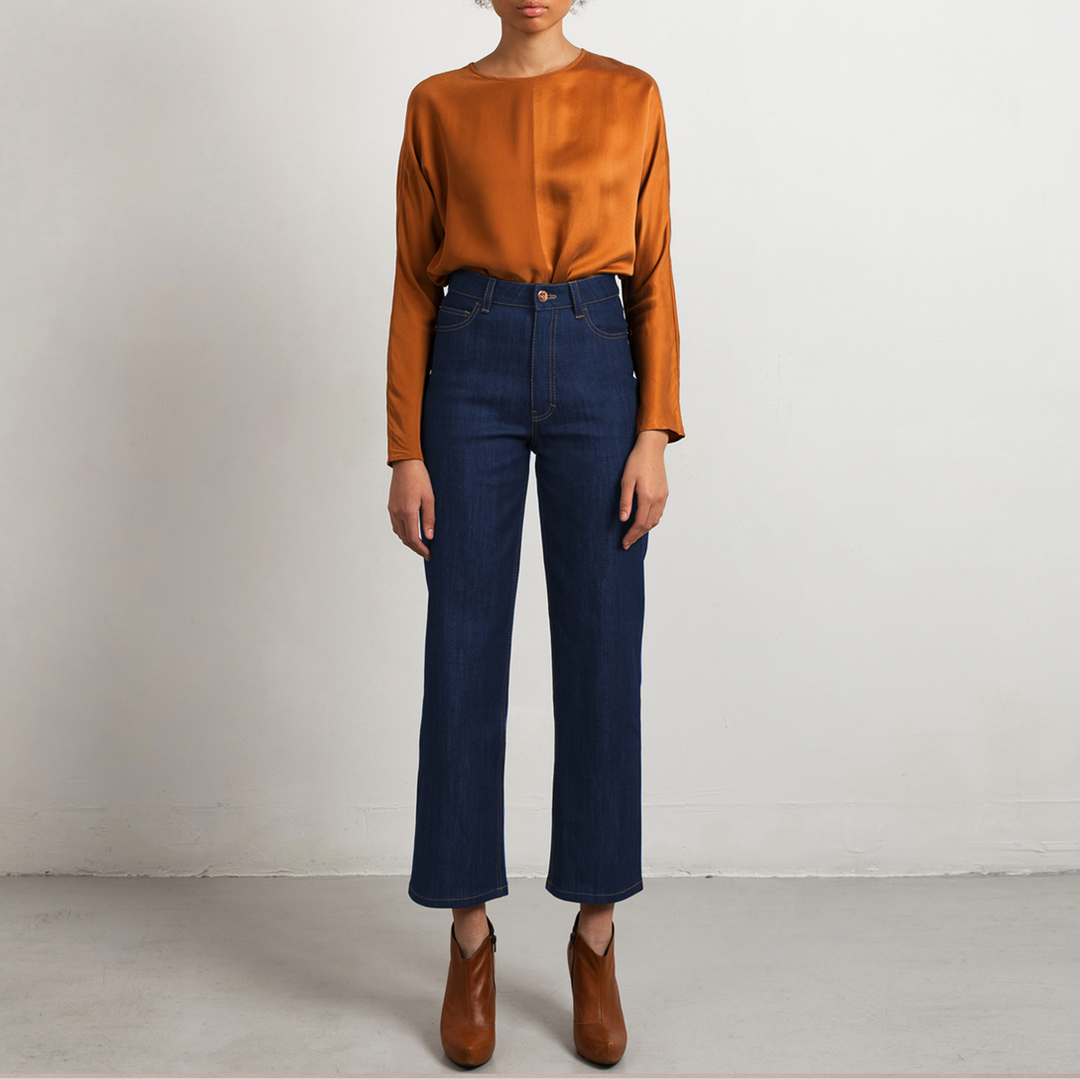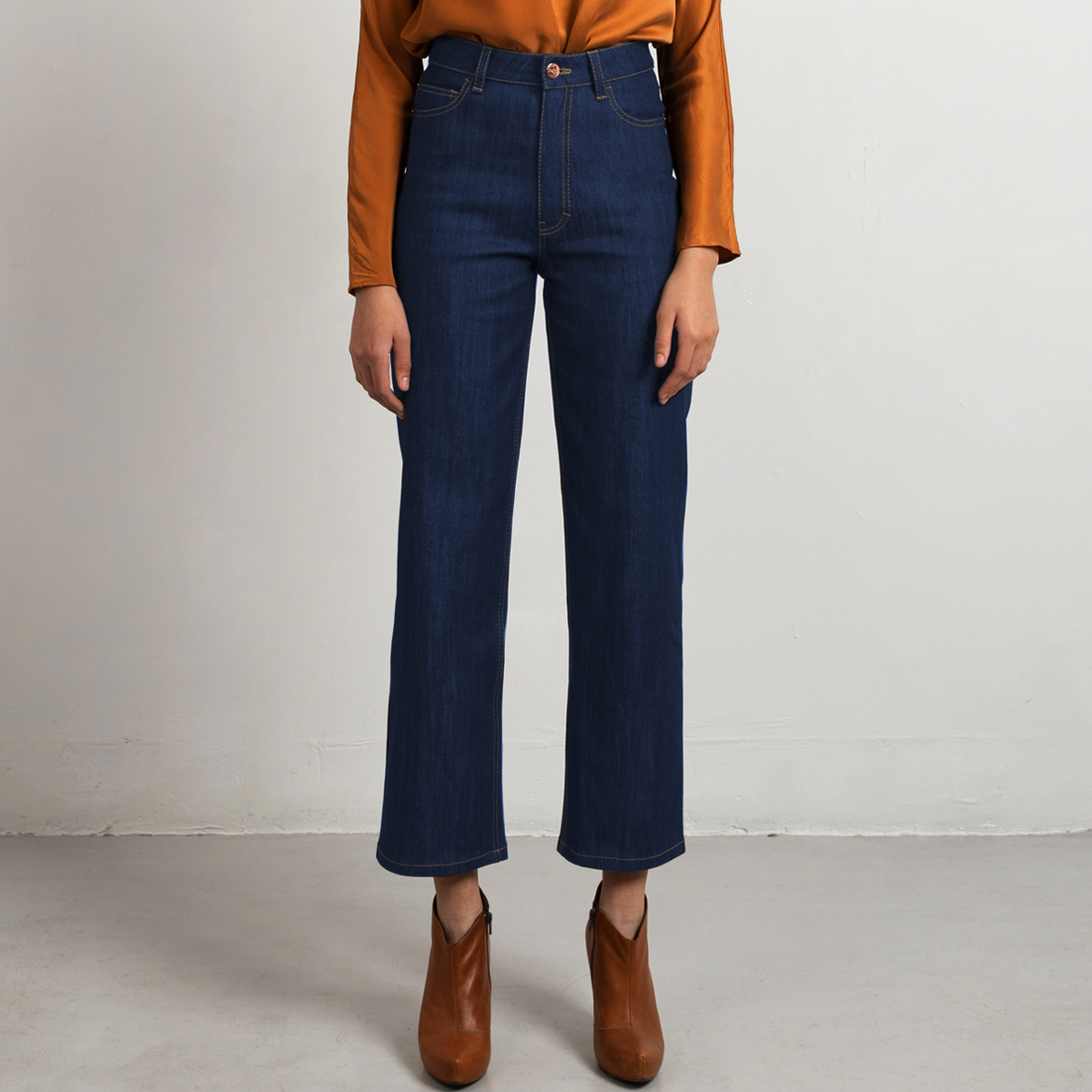 This is our modern wide leg jeans with high waist. It has a wide leg, a high waist and fits tightly over the hips and bottom. The pockets are a bit bigger than our regular straight leg and have a flattering placement.