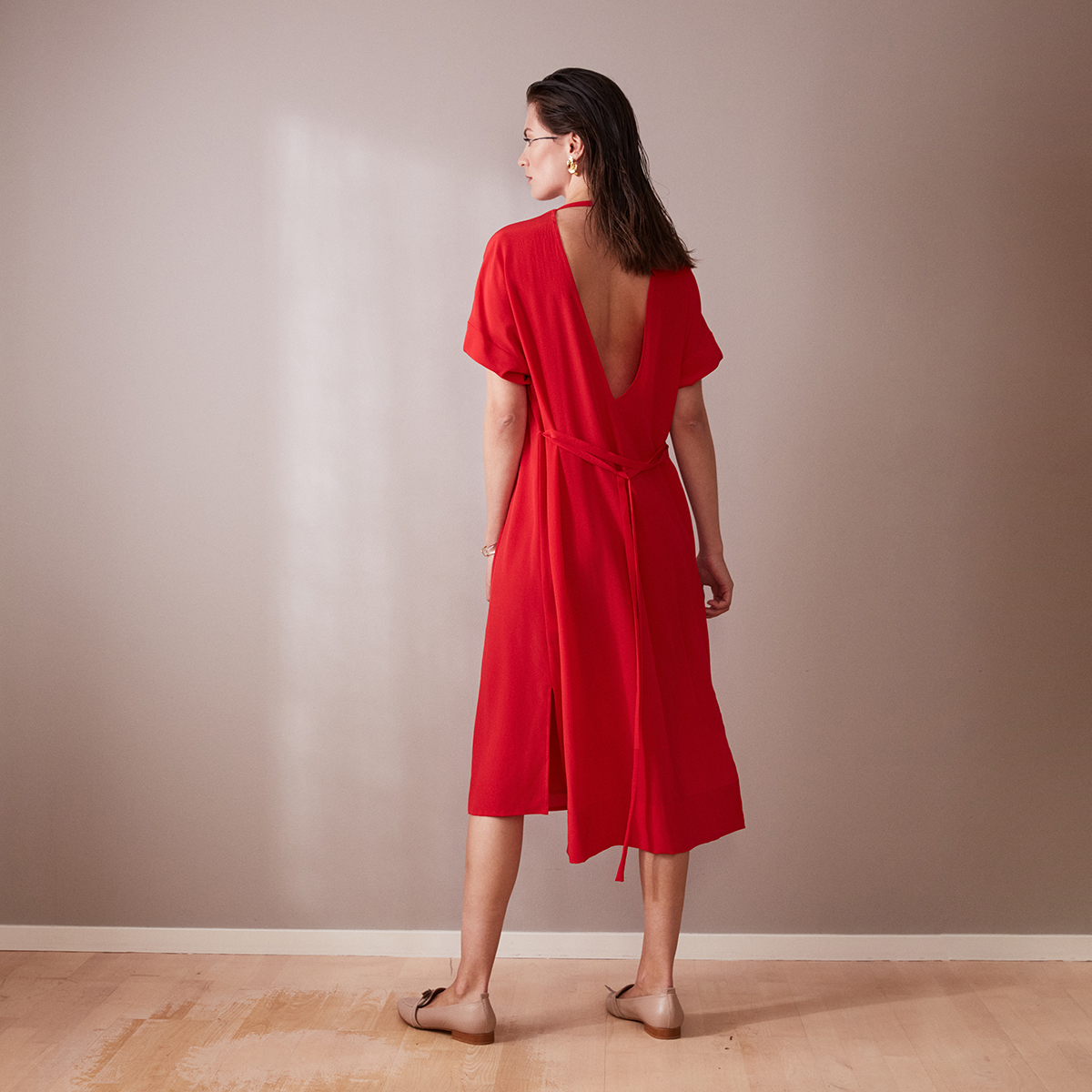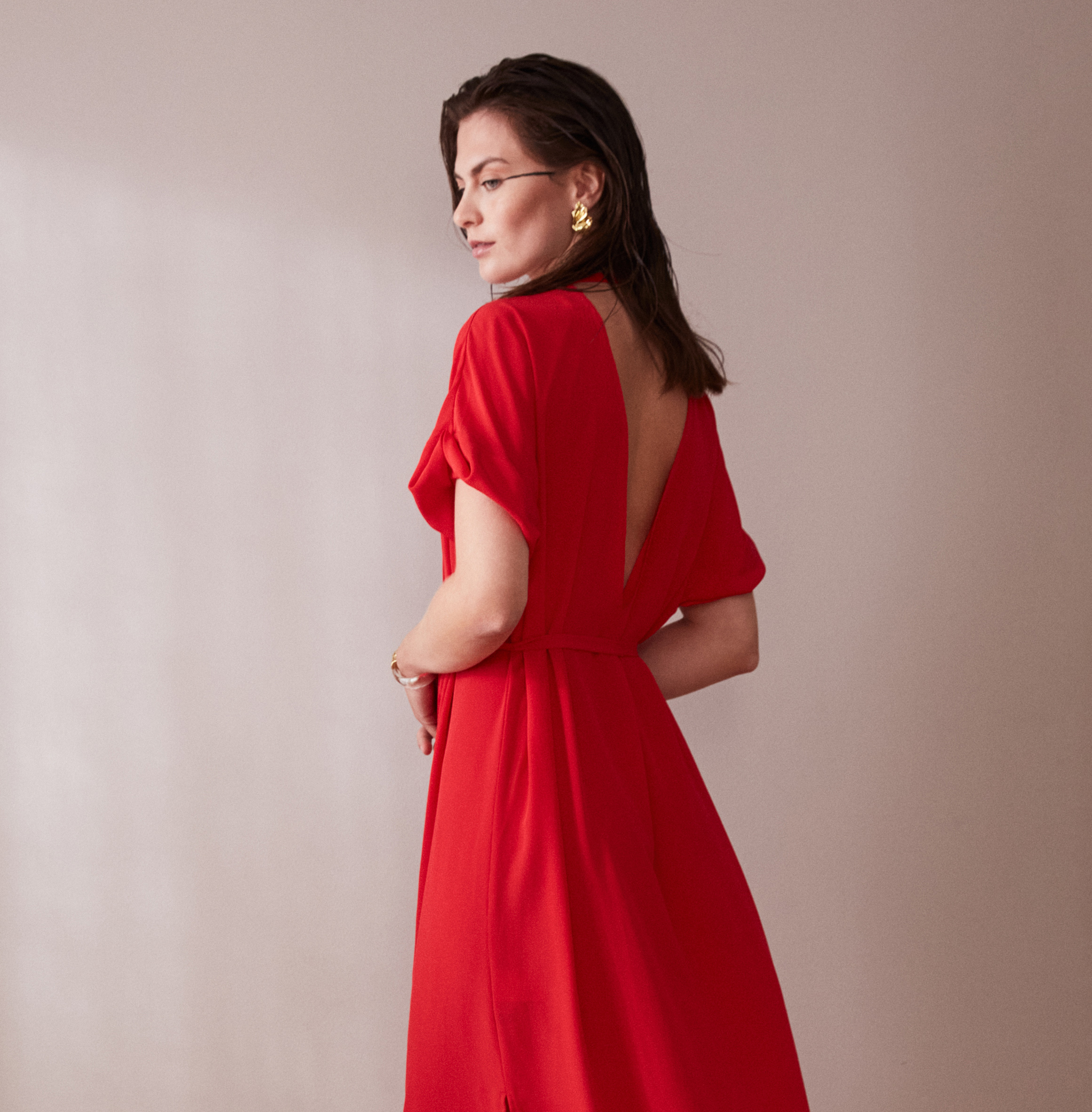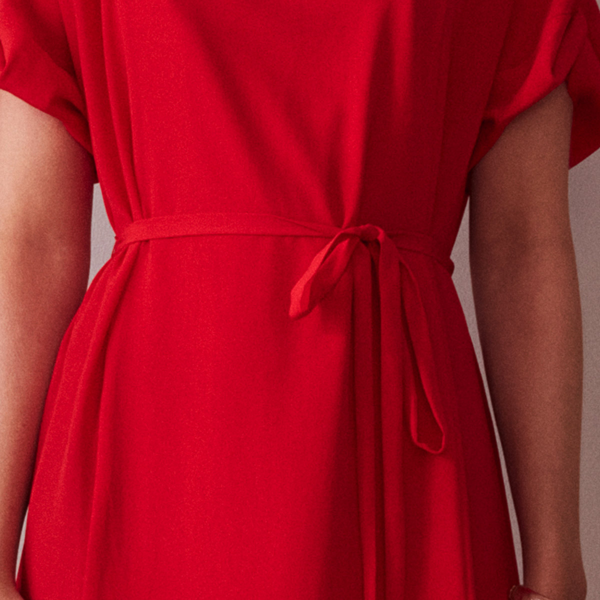 The red silk crepe fabric is a limited edition in our ready-to-wear collection. That means that there are only a few items available. Be quick if you like this beautiful dress!