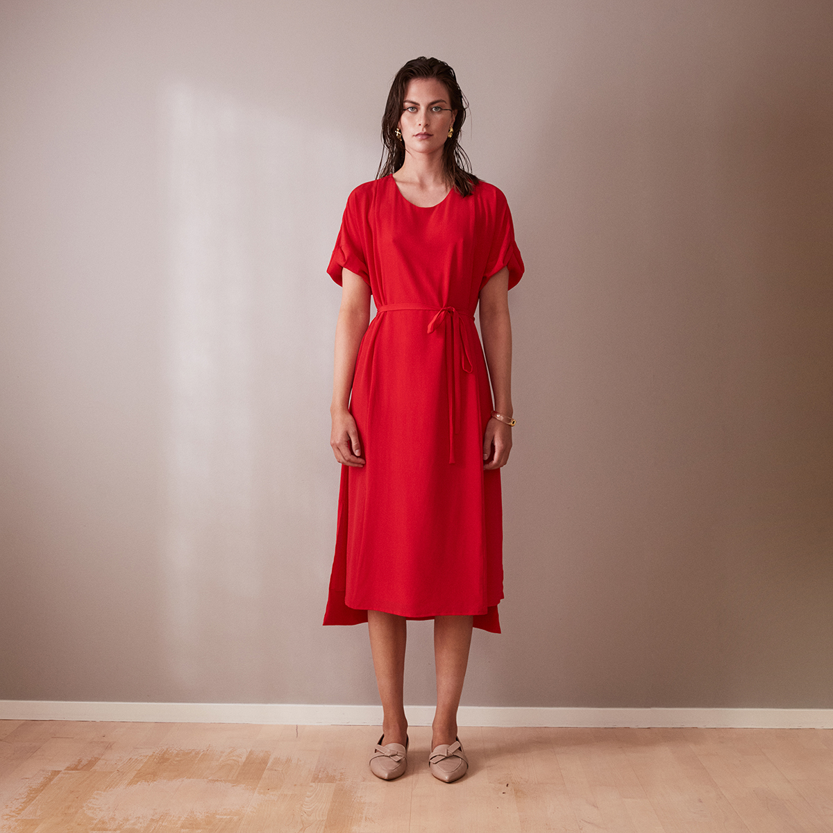This stunning red silk midi dress called Day dress is crafted from luxurious silk deadstock fabric. That means it combines style and sustainability beautifully. Its midi enkle and relaxed fit create a modish yet comfortable silhouette that you’ll love to wear all day. The soft silk crepe drapes effortlessly, providing a breathable feel that moves with you.
