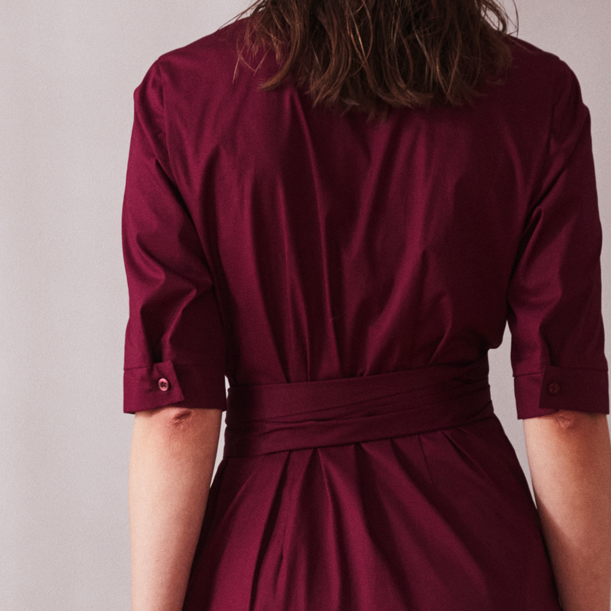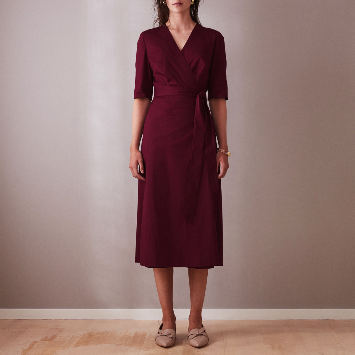 This midi wine-red wrap dress is a versatile, timeless addition to any wardrobe.