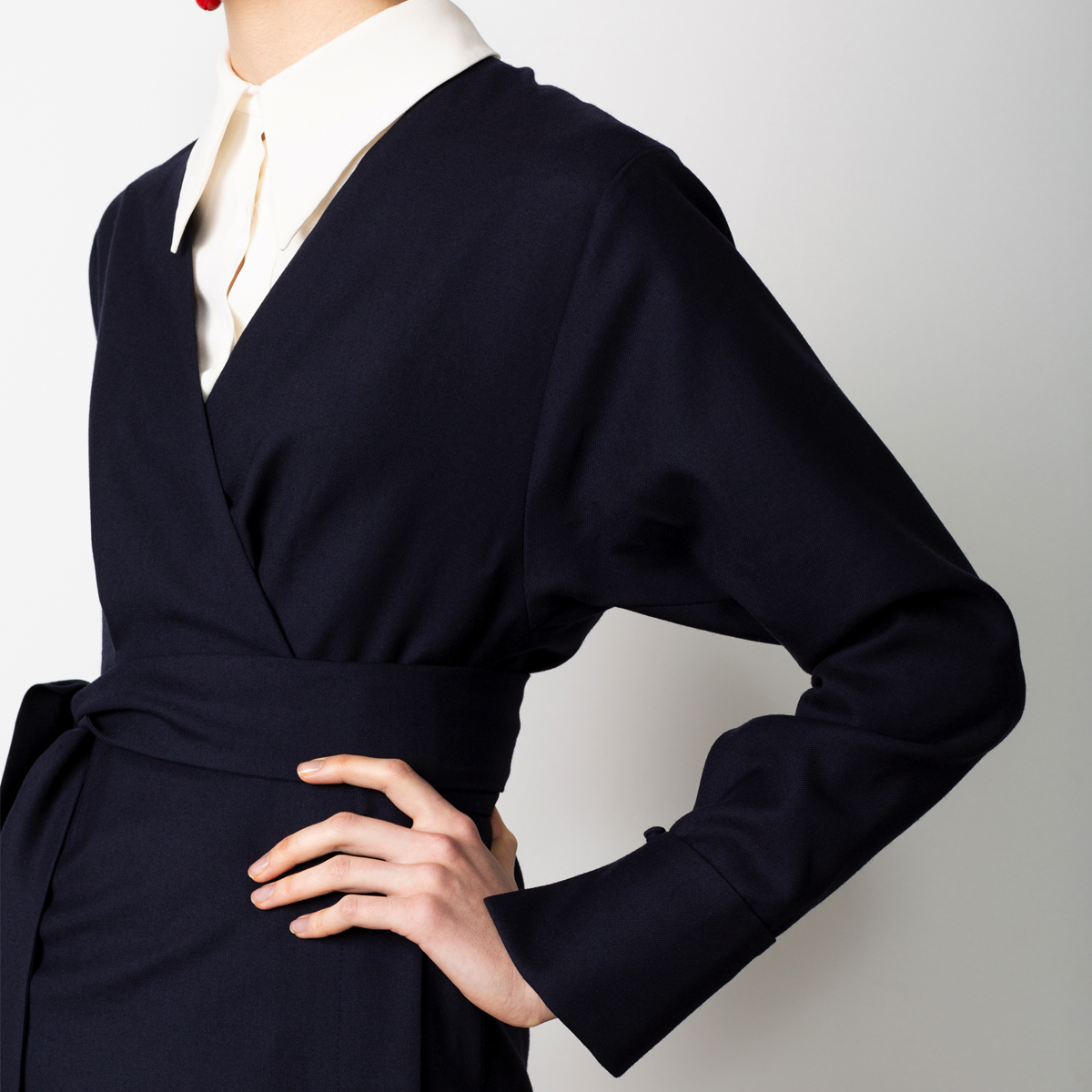 The wrap dress is a real classic! This version is made in our popular virgin wool quality. The dress is fully lined in a soft cupro and has playful cuff witch fabric covered buttons.