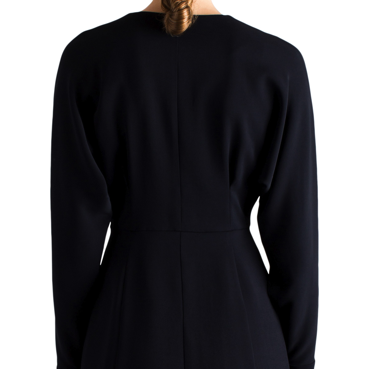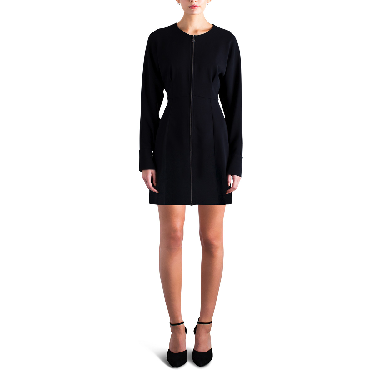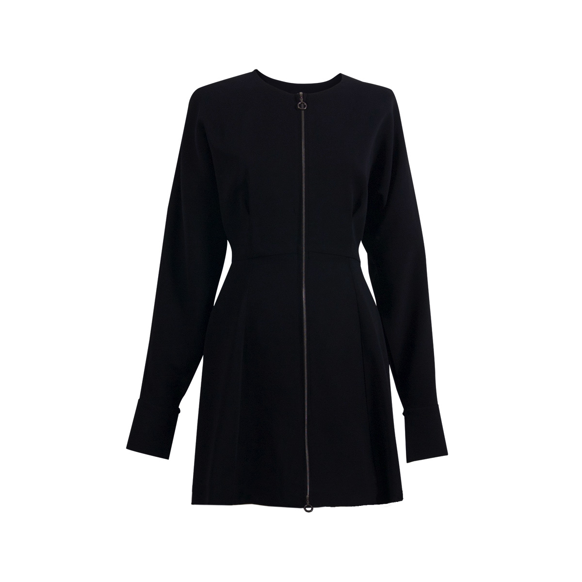 Covered buttons at cuffs. Exposed silver zipper gives an updated, slightly edgy and youthful touch. Wear as a dress or unzipped over any outfit as a lighter coat. A hybrid of the “little black dress” and the classical light weighted coat.