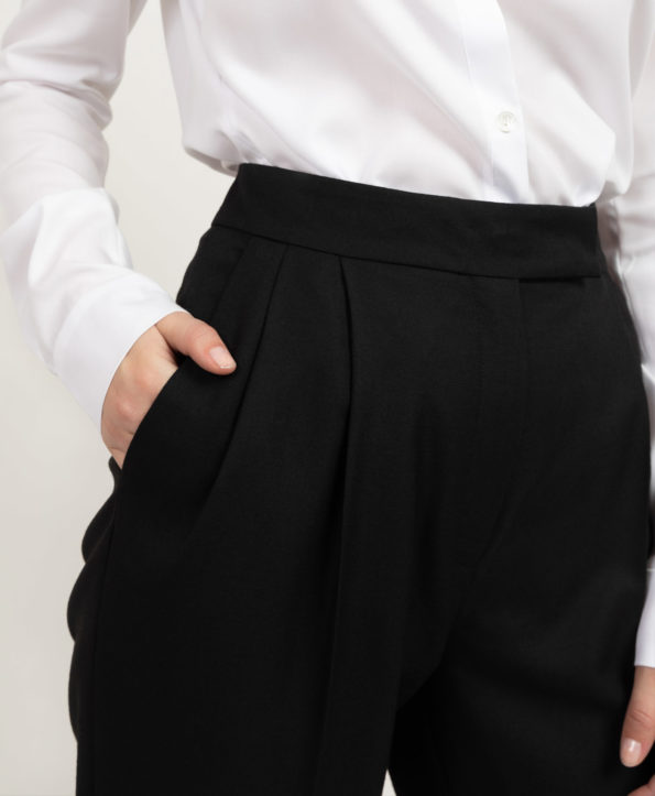 For a laid-back vibe, pair these pleated trousers with white sneakers, or opt for sophistication with heeled ankle boots that effortlessly elongate your legs. Elevate your ensemble by coordinating them with a silk blouse, adding a touch of feminine elegance to your distinctive style. Matched together with Blazer Grace you have a perfectly modern suit.