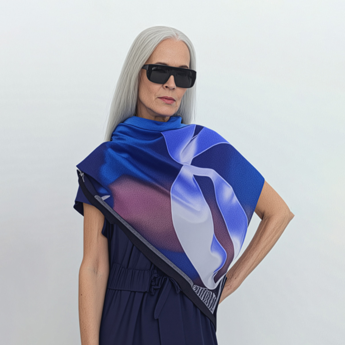 Into The Blue is designed for those who love prints with personality. It’s graphic, organic, and creative — a scarf that transforms simple outfits into statement looks.