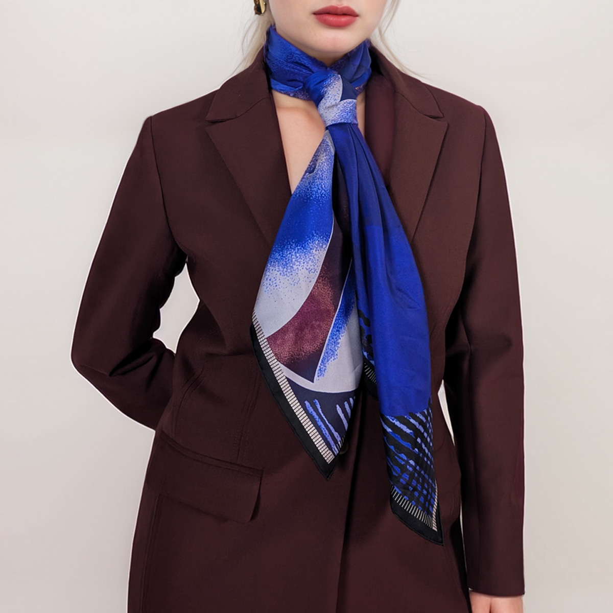 Thanks to its medium size, this silk scarf with blue print is endlessly versatile. Wear it loosely draped over the shoulders for an artistic statement. Knot it at the neck with a tailored blazer for modern polish. Or tie it long and slim for a chic, contemporary edge. It also works beautifully as a head wrap or even styled as a belt.