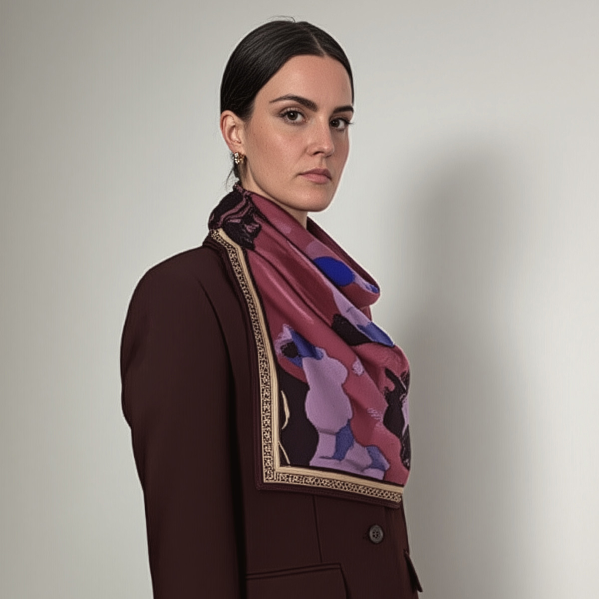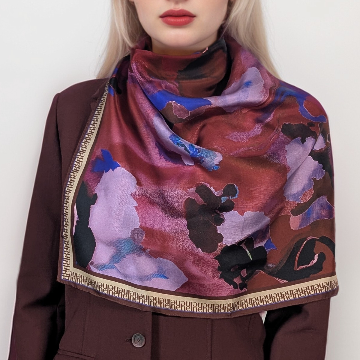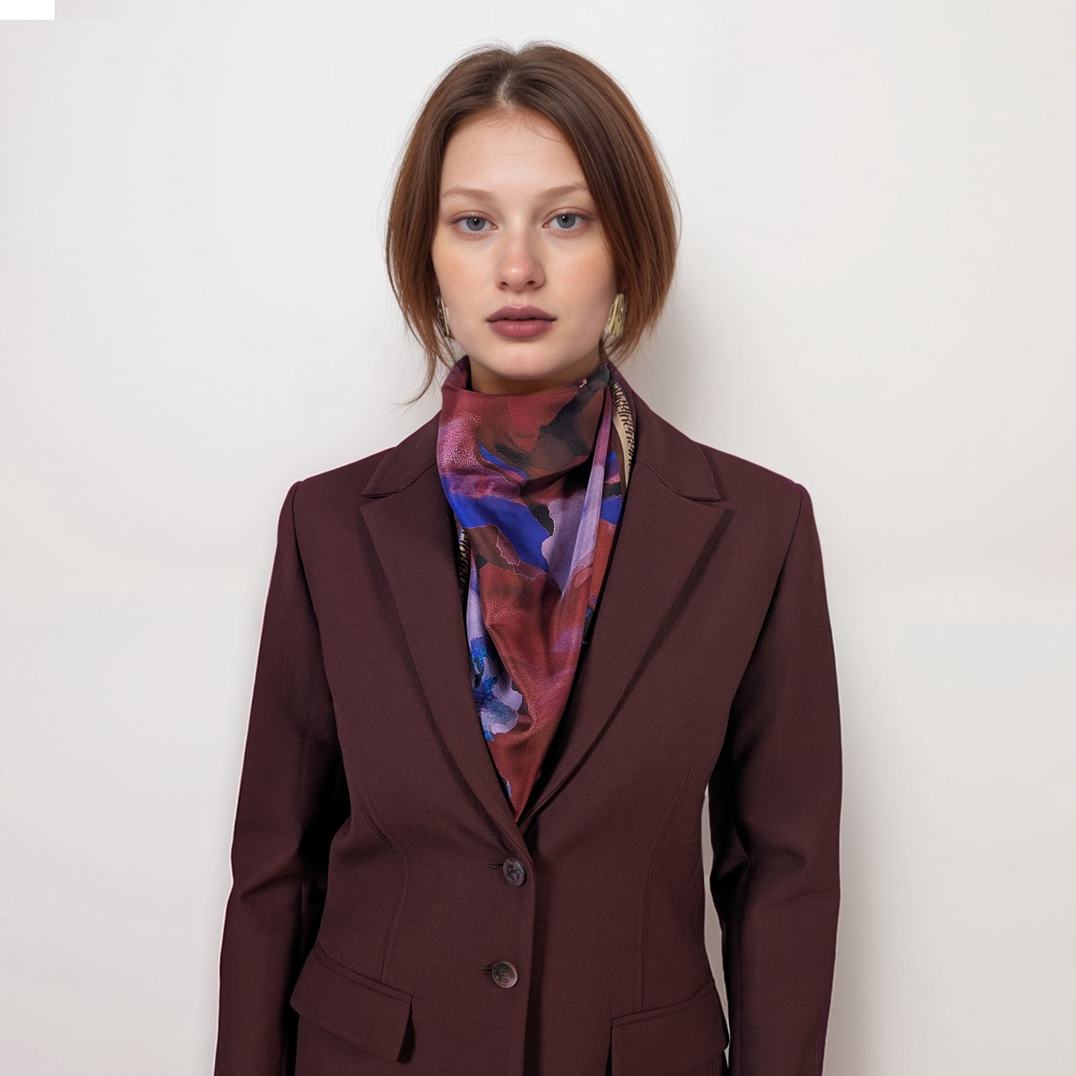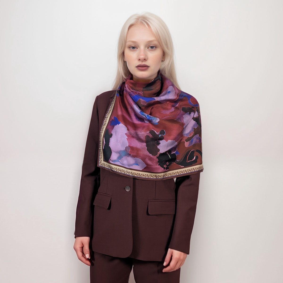 The double-sided print reveals abstract florals in deep aubergine, soft blush, and striking violet. Hints of midnight blue and black create dramatic contrast. Together, these tones evoke the richness of Burgundy wine at dusk. It’s expressive, modern, and endlessly wearable.