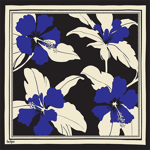 The design features a large-scale blue flower, contrasted with ivory petals and deep black shadows. The bold motif is graphic and modern — yet timeless in its simplicity. Framed by a clean monochrome border, it creates a powerful visual impact from every angle.