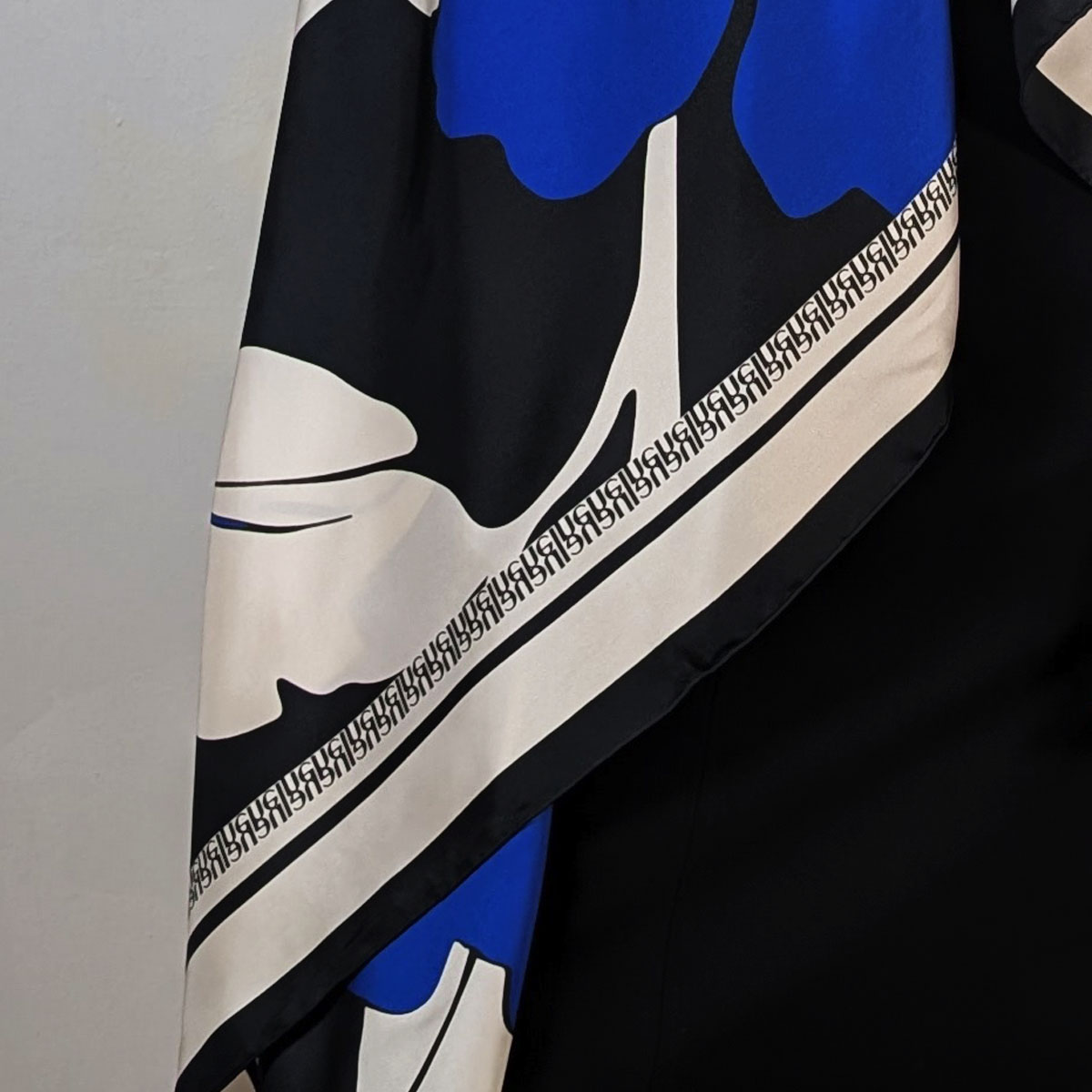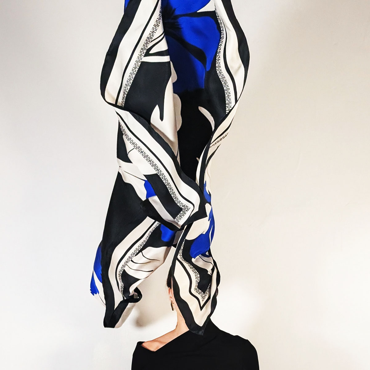 Wear it as a shawl for cool evenings. Wrap it around your shoulders for a chic daytime look. Or style it as a dramatic top, head wrap, or beach pareo. No matter how you wear it, this large silk scarf with blue flowers turns every outfit into a statement.