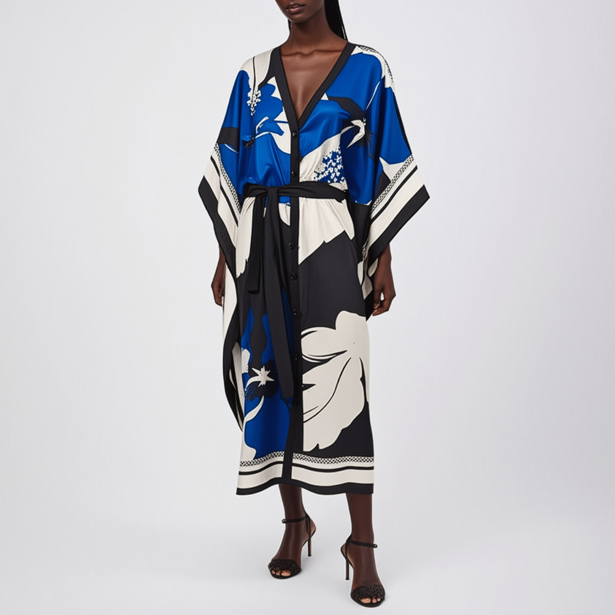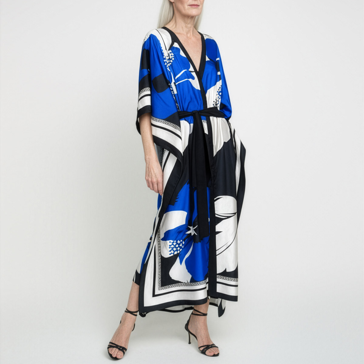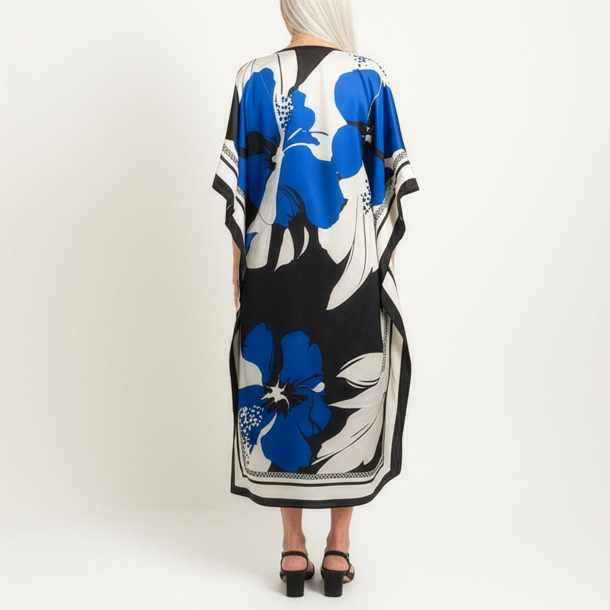 Riviera silk twill caftan dress is the ultimate expression of laid-back luxury. Made from two silk scarves, this piece flows effortlessly, draping the body in soft elegance while showcasing a bold, oversized floral print in blue, white, and black. The smooth twill weave gives it a gentle sheen and graceful movement, perfect for sun-soaked days or balmy evenings.