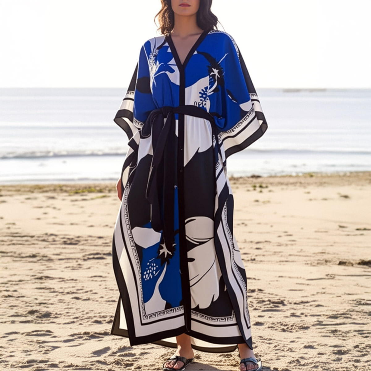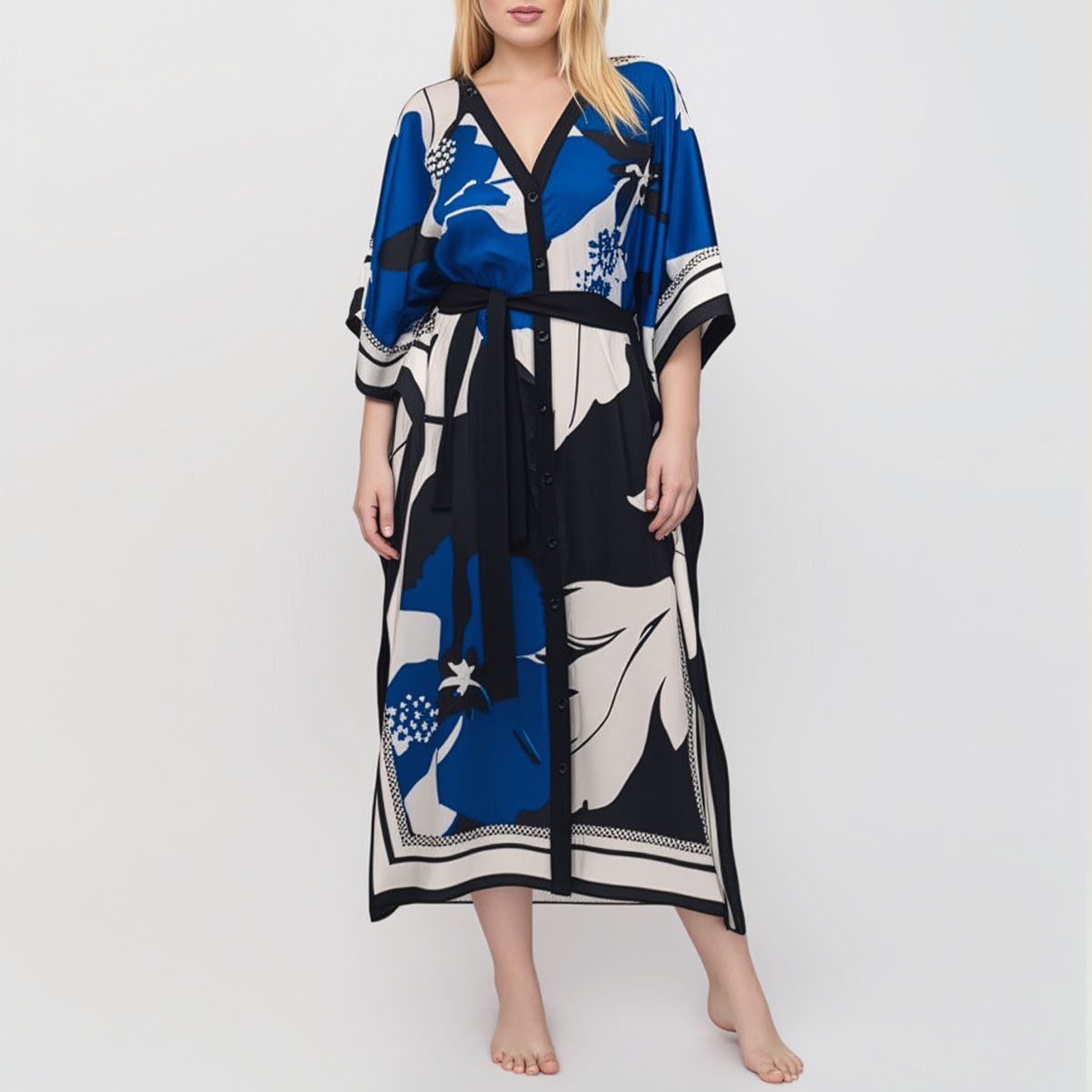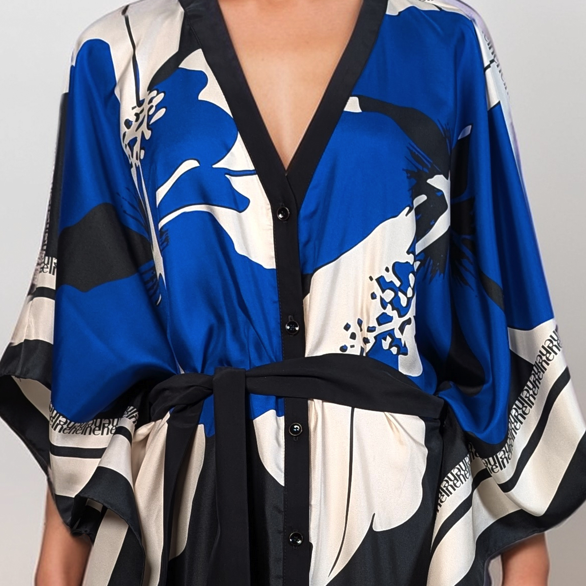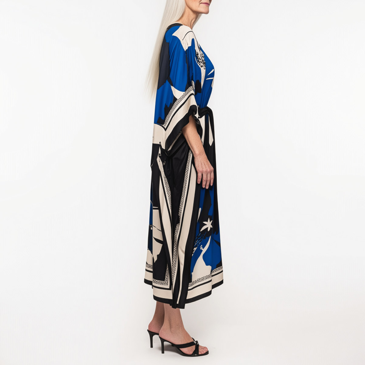 Riviera silk twill caftan dress is the ultimate expression of laid-back luxury. Made from two silk scarves, this piece flows effortlessly, draping the body in soft elegance while showcasing a bold, oversized floral print in blue, white, and black. The smooth twill weave gives it a gentle sheen and graceful movement, perfect for sun-soaked days or balmy evenings.
