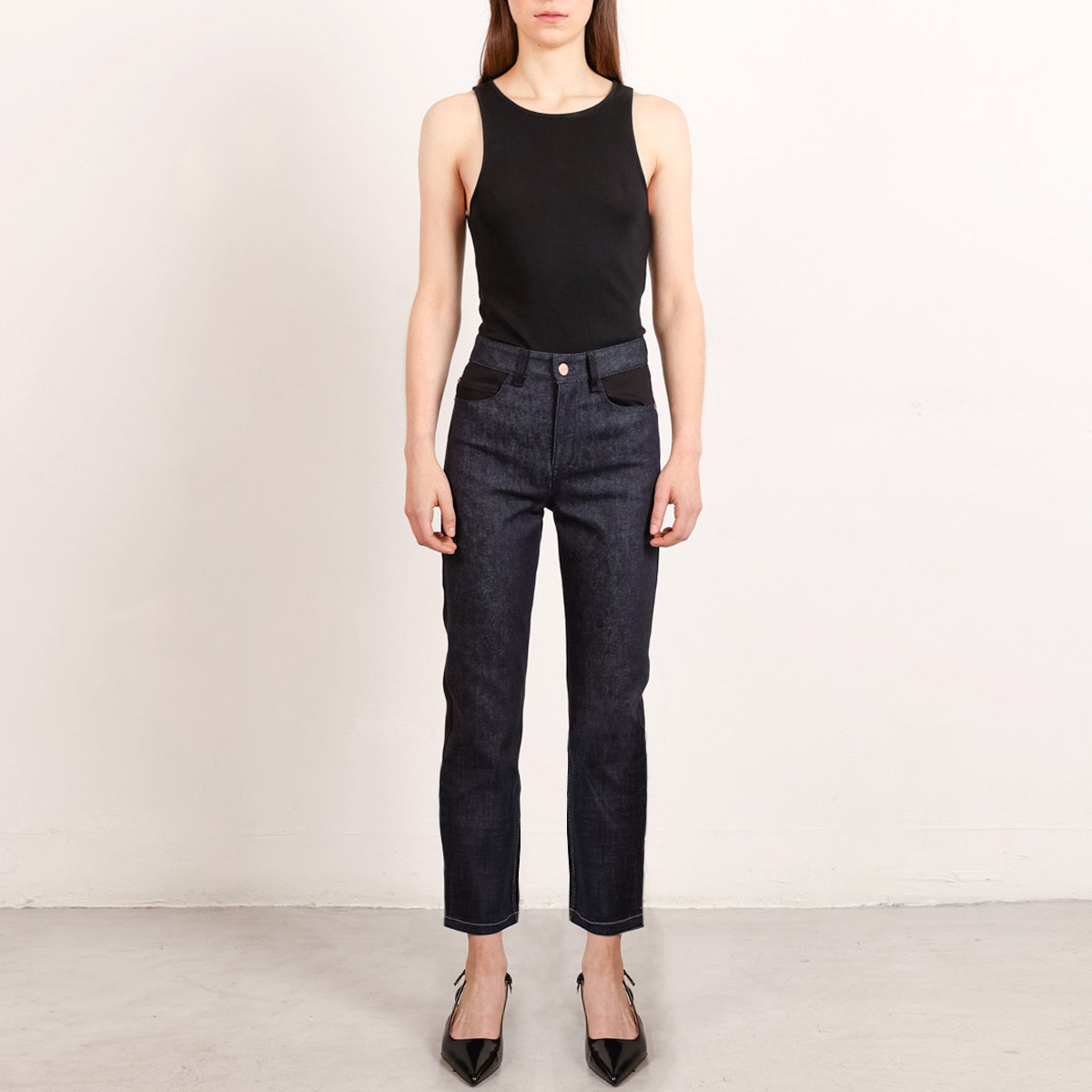 Straight leg colour block cropped jeans in dark blue and black