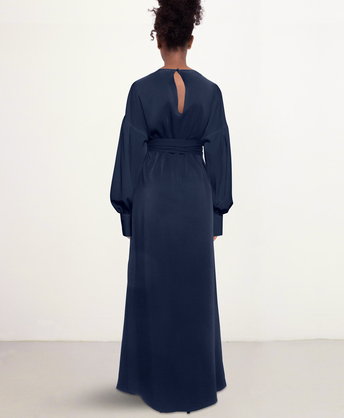 We love the versatility of this custom-fit dress in navy blue. Depending on how you customize it, it can either become your best basic or your outstanding evening gown. Choose the cascading gathered sleeves and wear with the belt to accentuate your waist and temper the flowing fit. The short black version with short sleeves is bound to become your wardrobe favorite and everyday dress. The long versions have a high slit in the side reveals just enough leg. Wear yours to parties with sandals and velvet clutch.