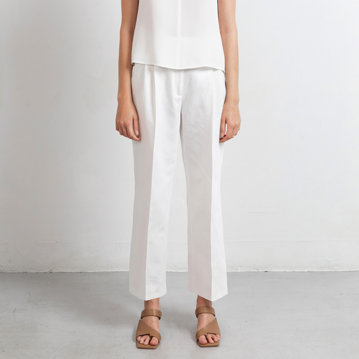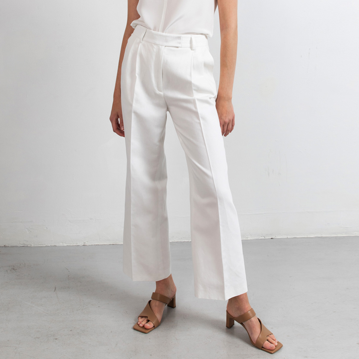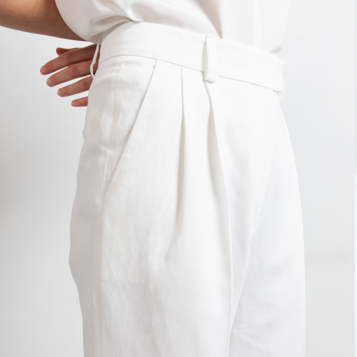 Swipe is our new semi dressed wide leg pants and are perfect to create a spring or summer well dressed look. These cropped pants are crafted in a soft yet sturdy cotton/linen/lyocell mix. The fabric is undyed and therefore 100% natural white. Swipe has pleats on the fronts for sharp but relaxed look. The pockets lining is designed to have minimun see through effect at the pockets.